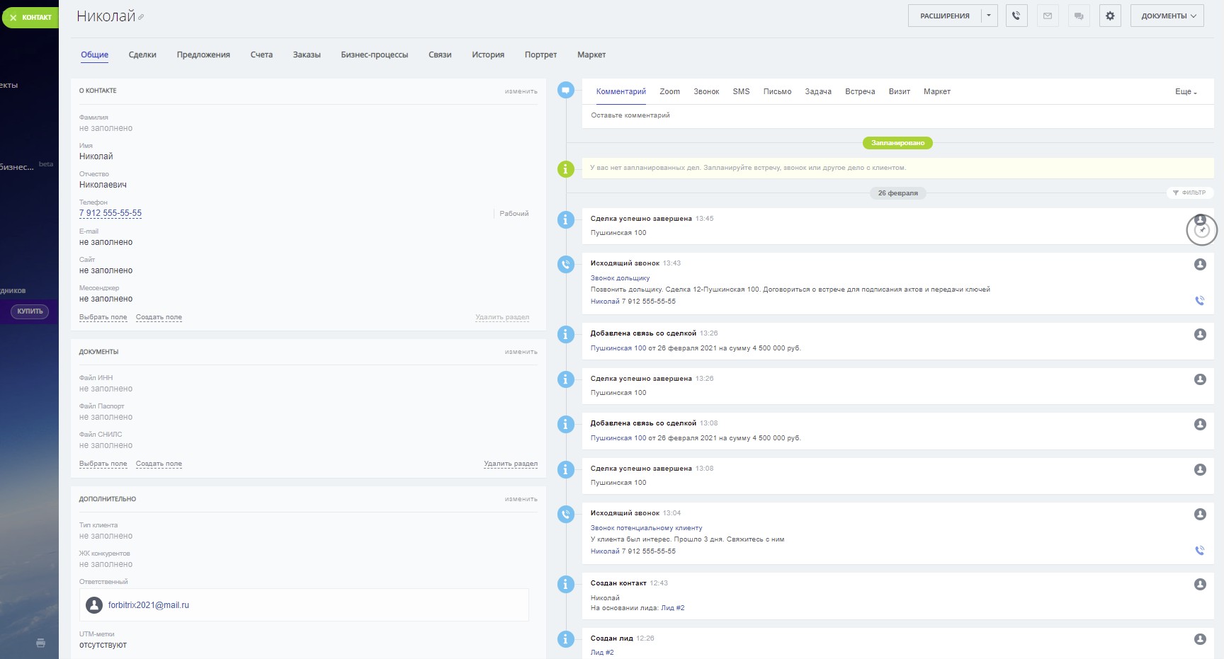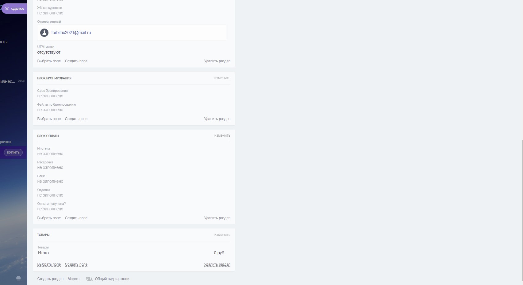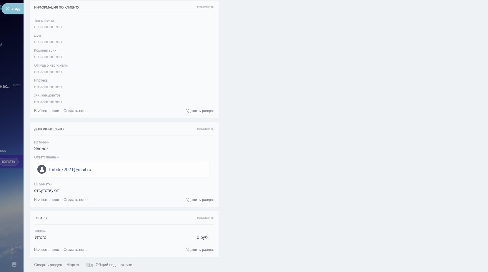4) настроенные карточки сделок, контактов, и лидов (см скриншоты)