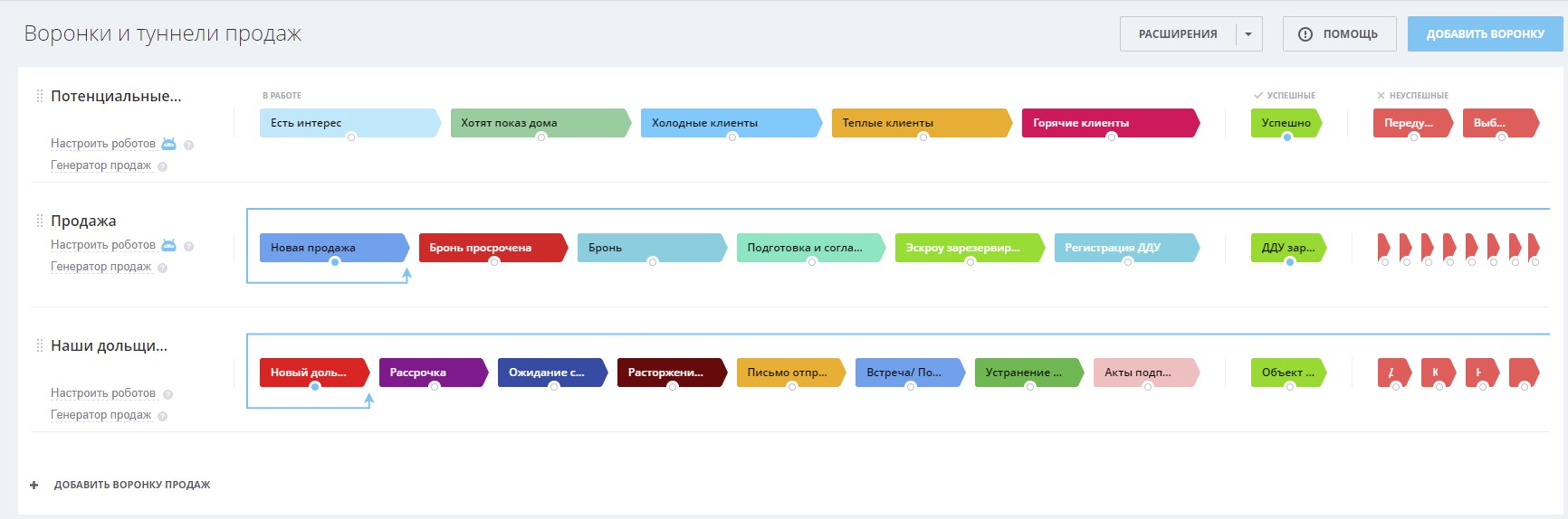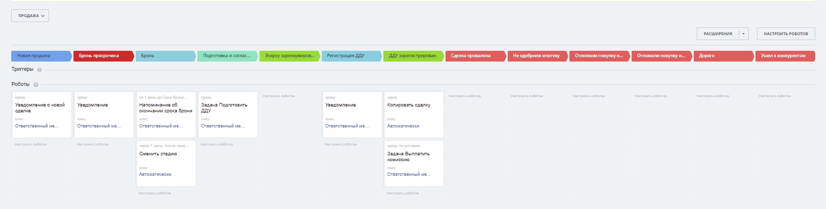 1) 3 воронки (“Потенциальные клиенты”, “Продажа”, “Наши дольщики”)