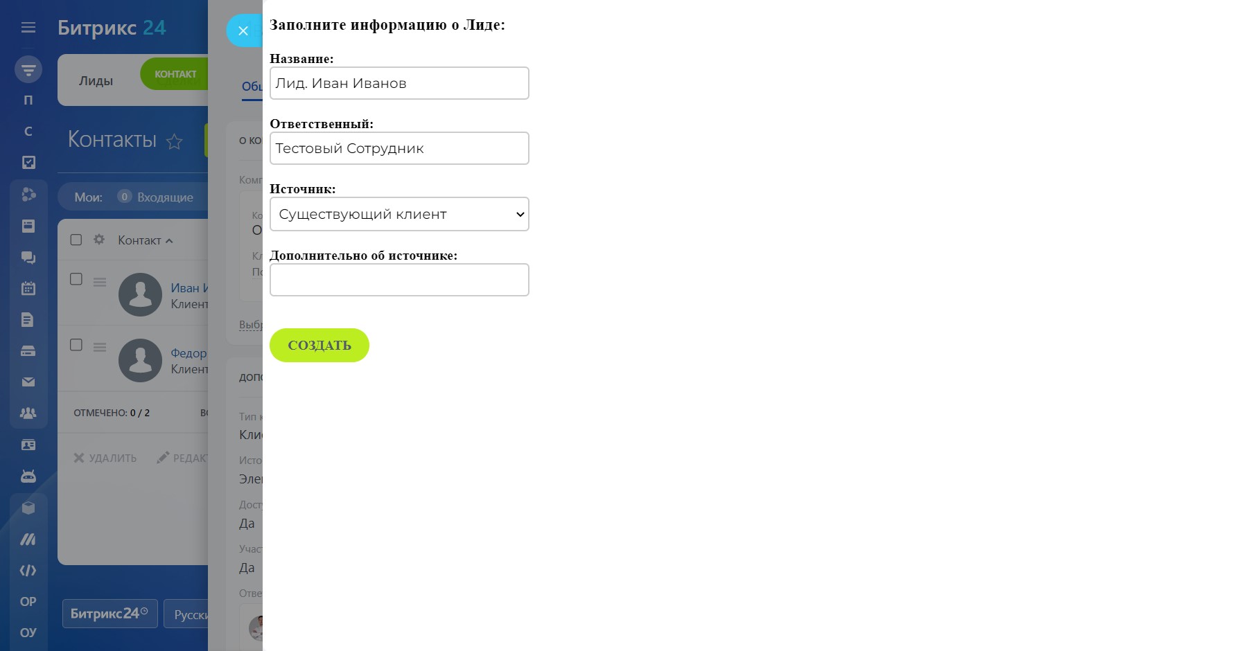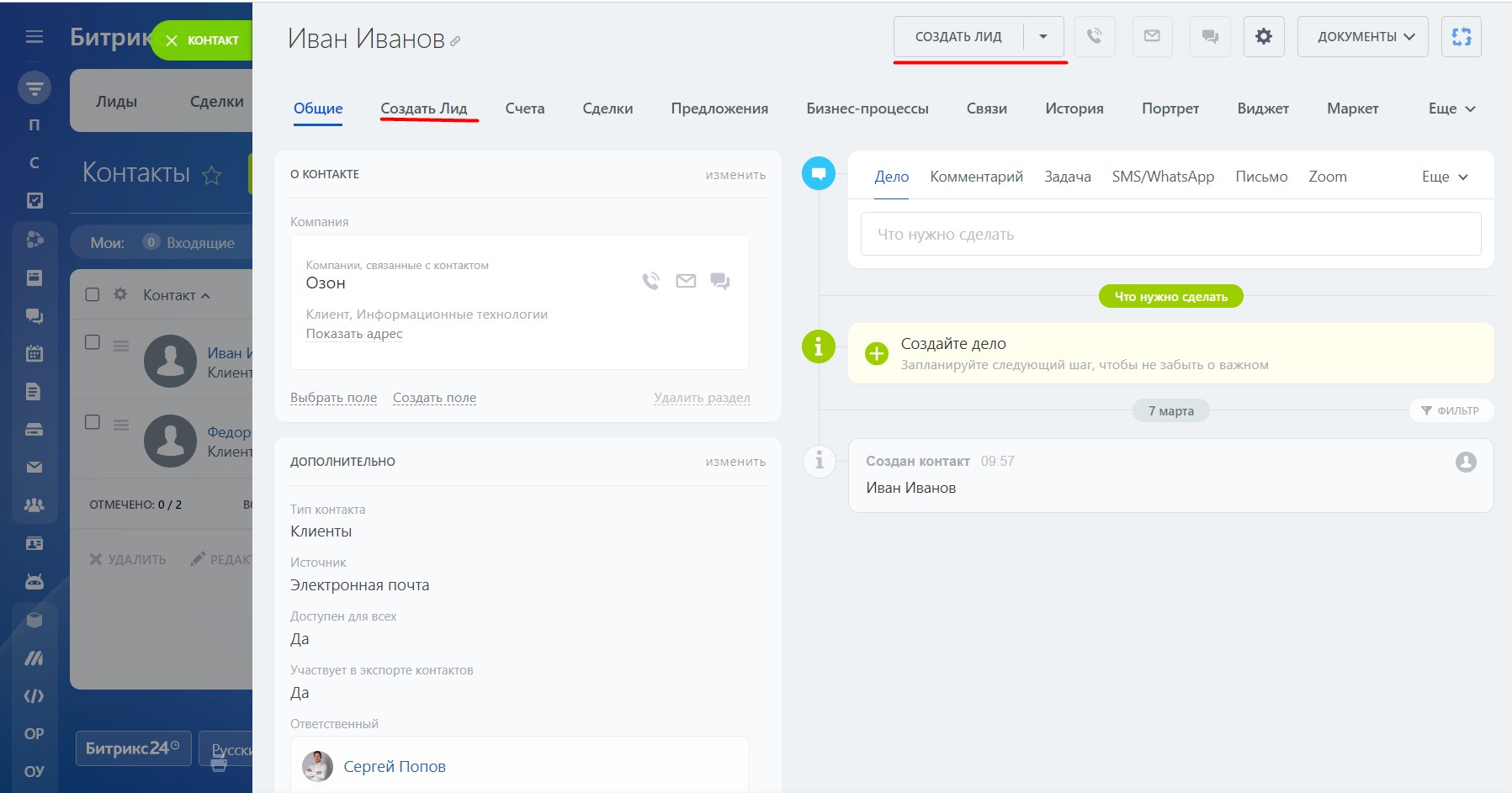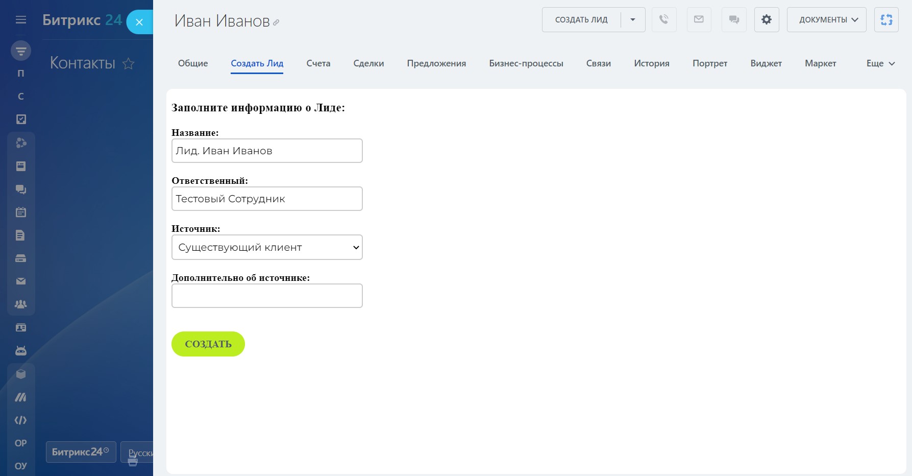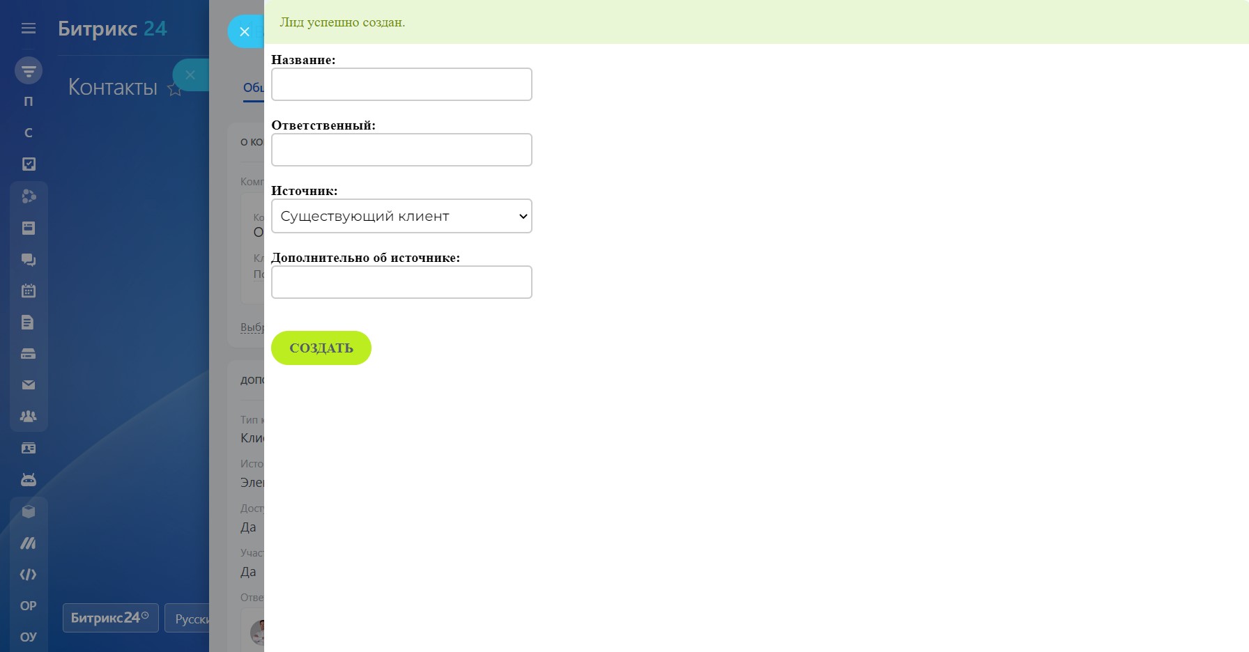 В верхнем меню (умные сценарии) карточек Контакта и Компании (и в табах: Общее, Счета, Связи и т.д.) появляется кнопка СОЗДАТЬ ЛИД.