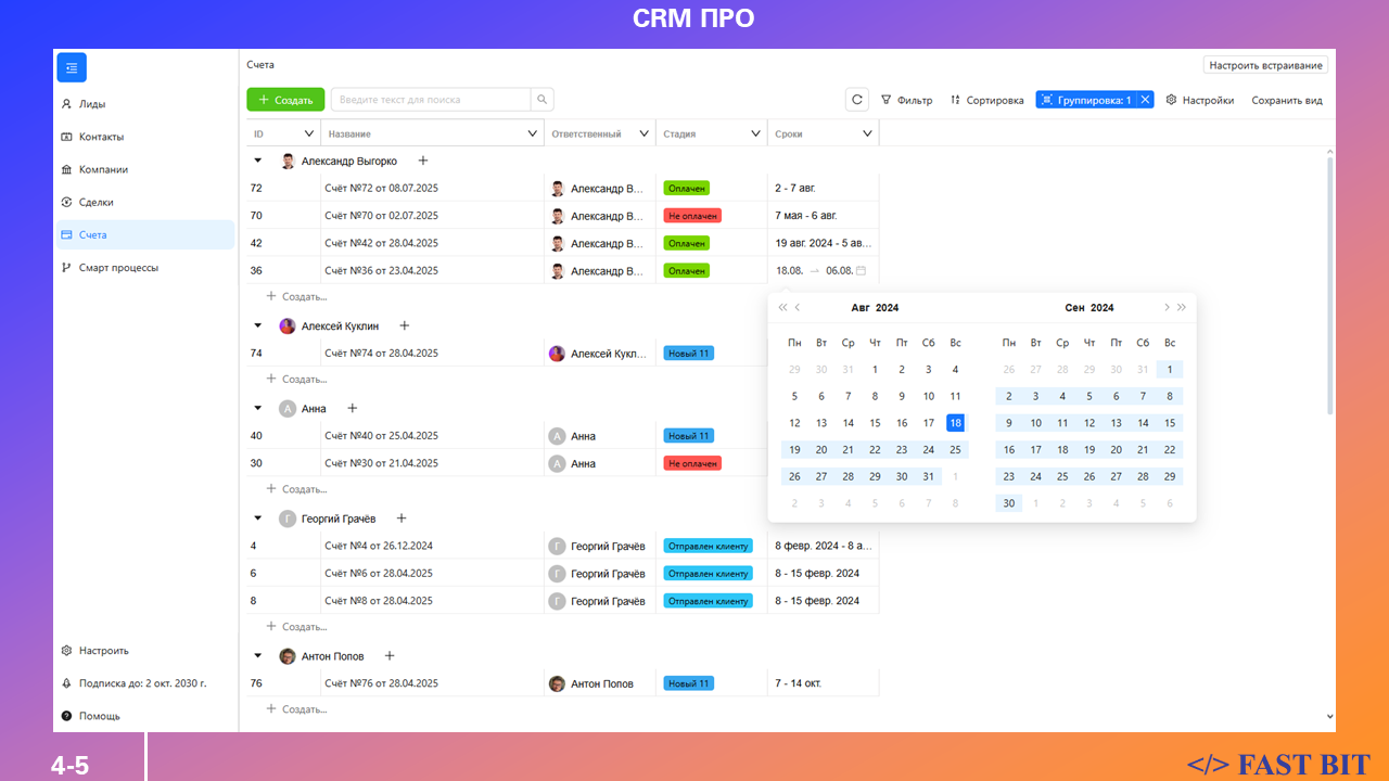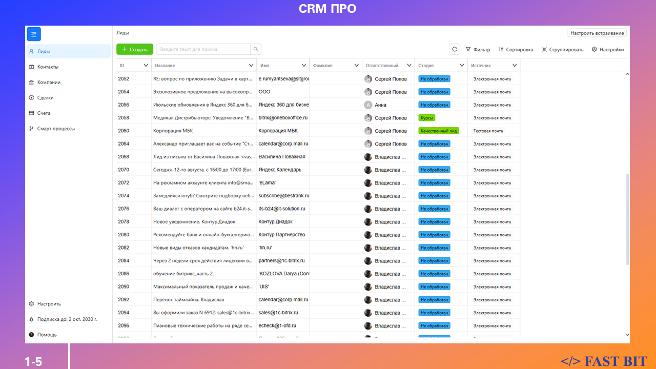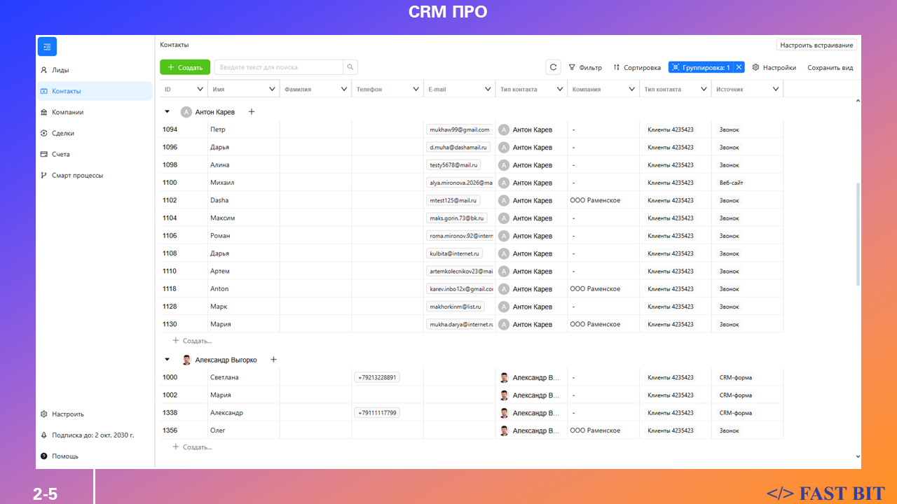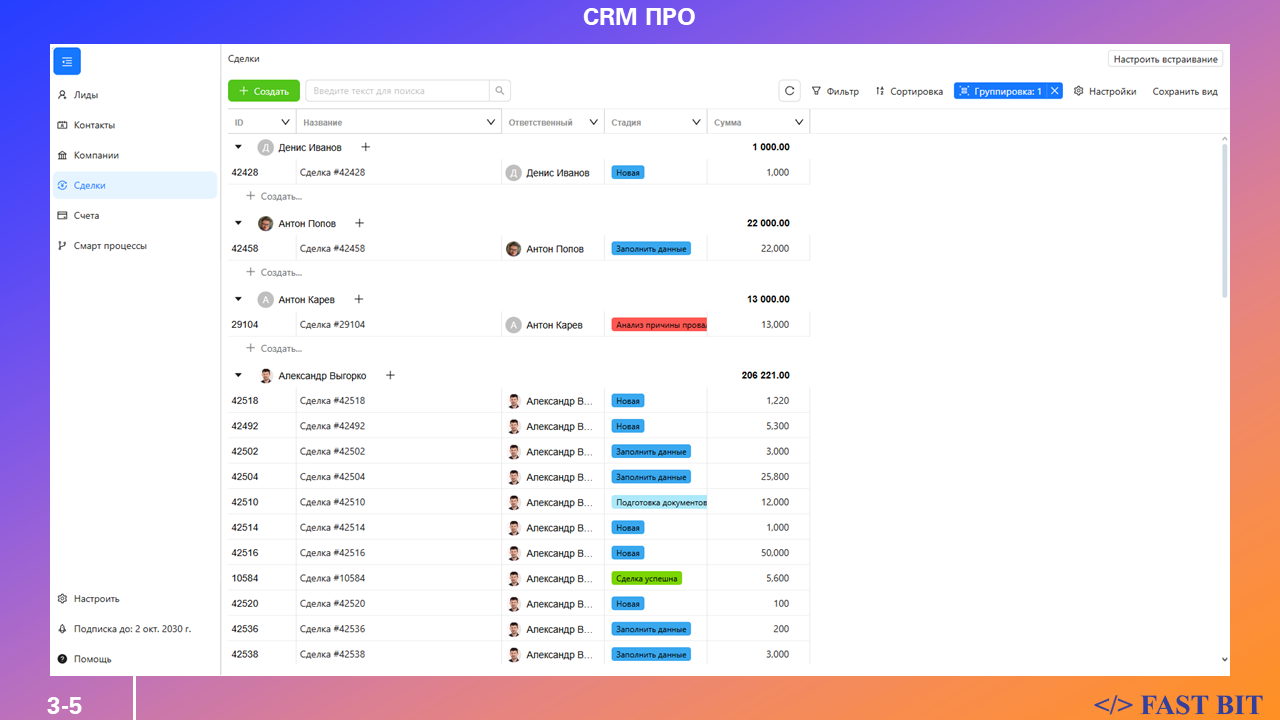 • Входит в подписку Fast Bit ПРО, которая открывает доступ не только к CRM ПРО, но и к другим решениям серии ПРО: Проекты ПРО, Скрам ПРО и другие.
