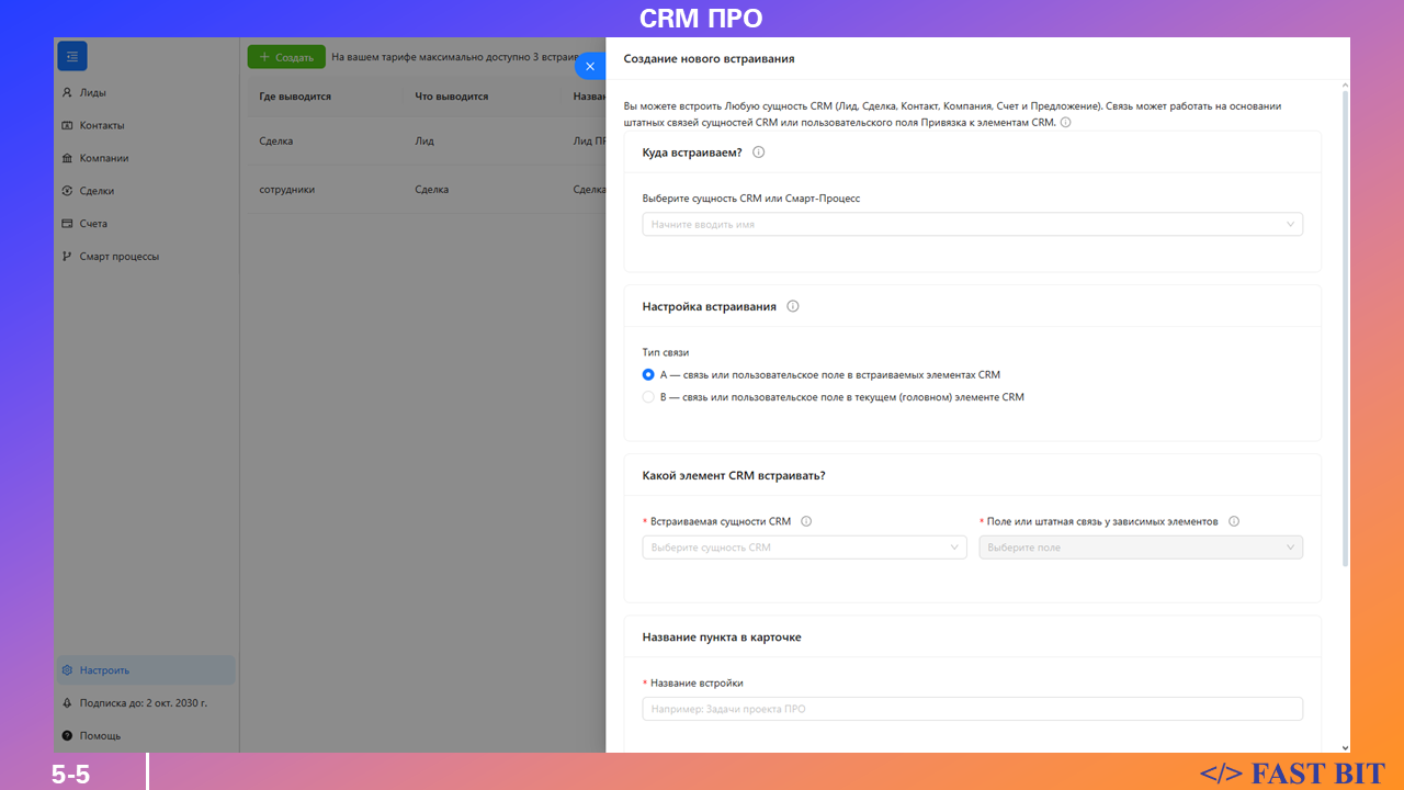 Приложение CRM ПРО позволяет создавать кастомные встройки в карточки элементов CRM (Контакт, Компания, Лид, Сделка, Коммерческое предложение, Счёт) и карточки Смарт-Процессов.
