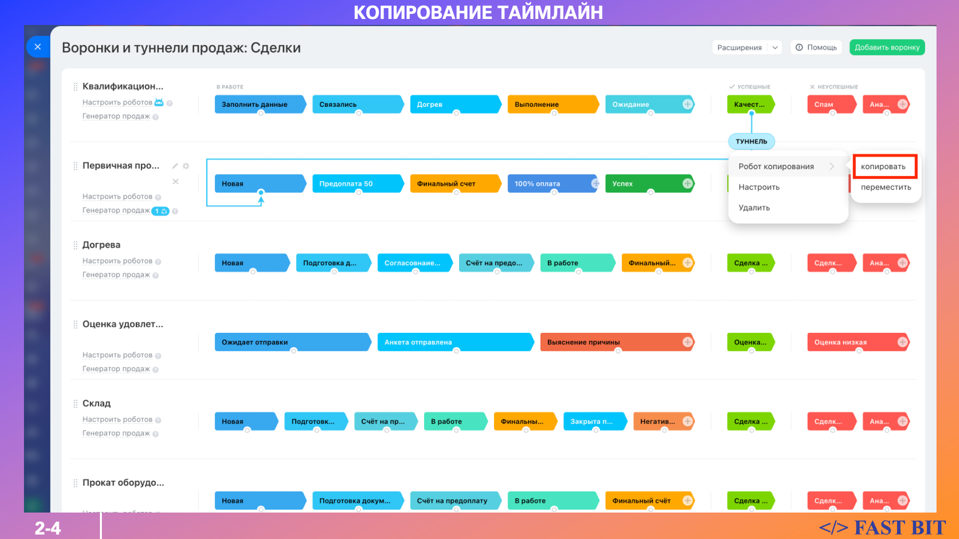 Б. Переместить. В таком случае наша исходная сделка переезжает в новую воронку вместе с таймлайном, но теперь становится непросто посчитать конверсию в первой воронке, т.к. все выигранные сделки перемещаются из неё в новую воронку.