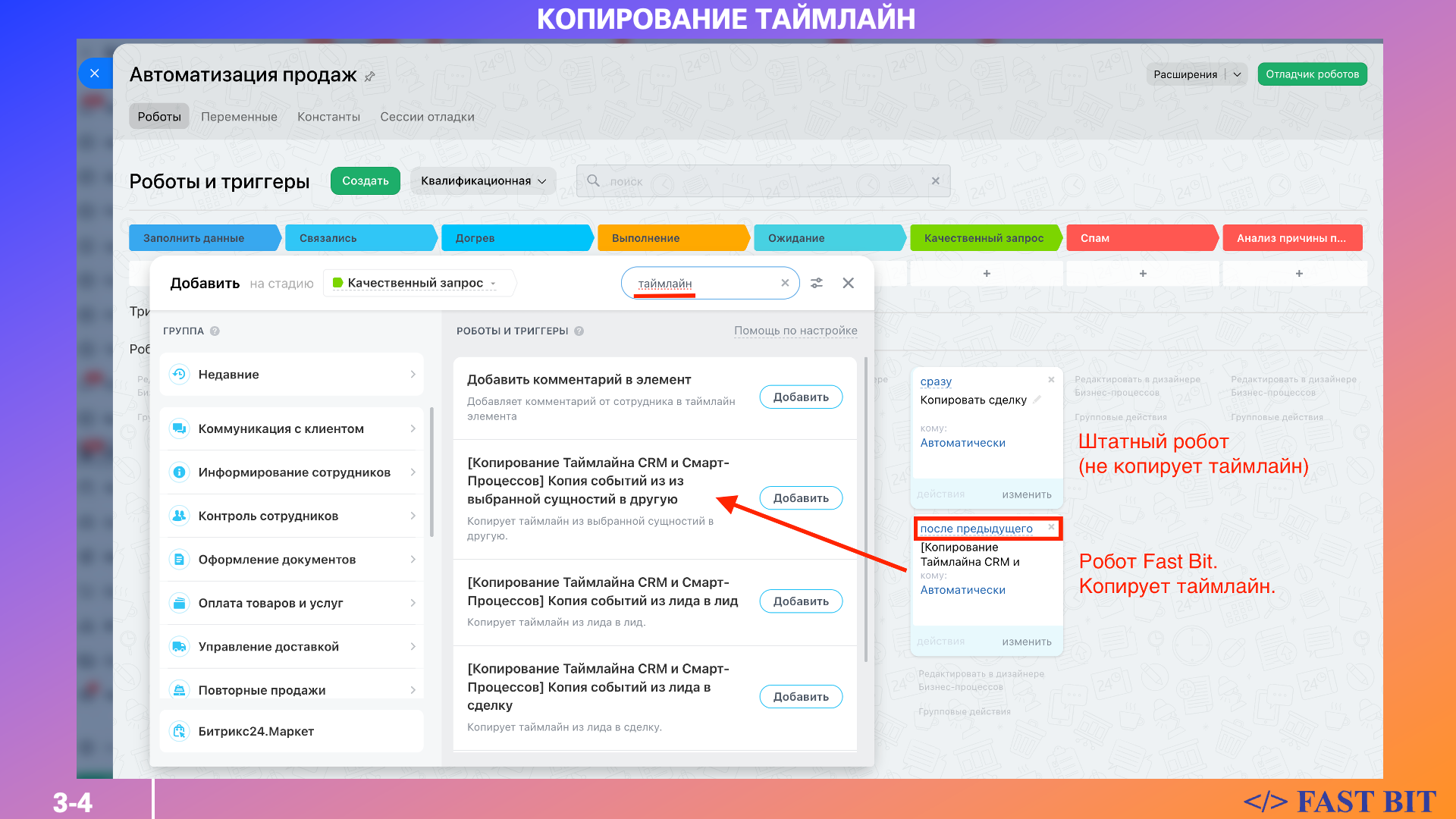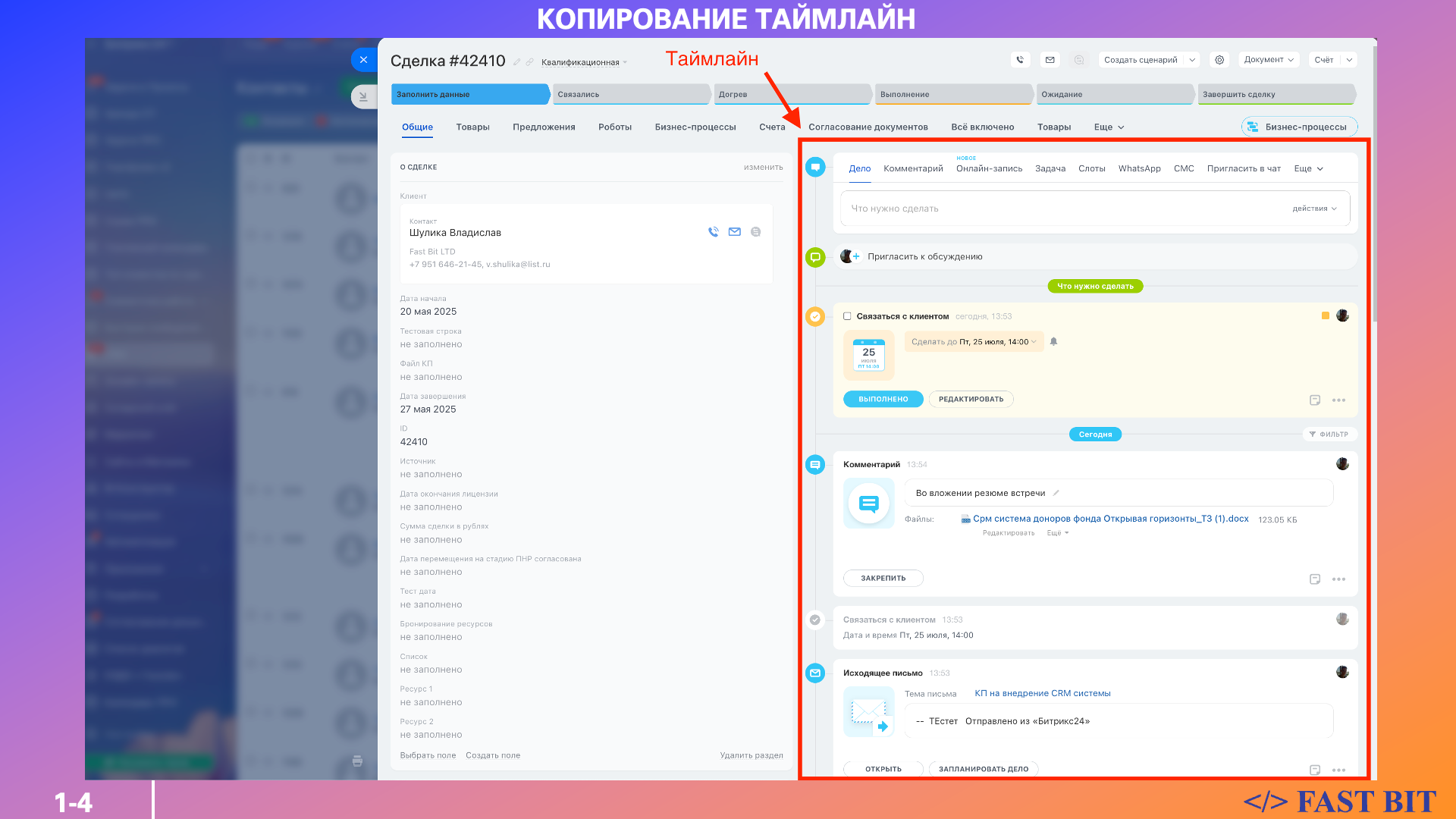 С помощью приложения Копирование Таймлайна Сделки вы можете использовать штатную настройку копирования, дополненную роботом копирования таймлайна.