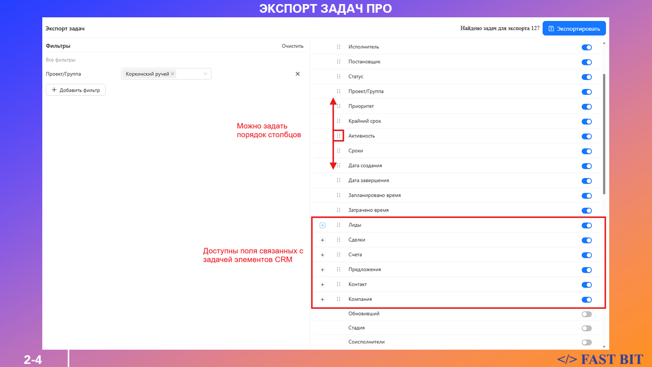 Выбрать, какие поля элементов CRM включить в экспорт (также с поиском).