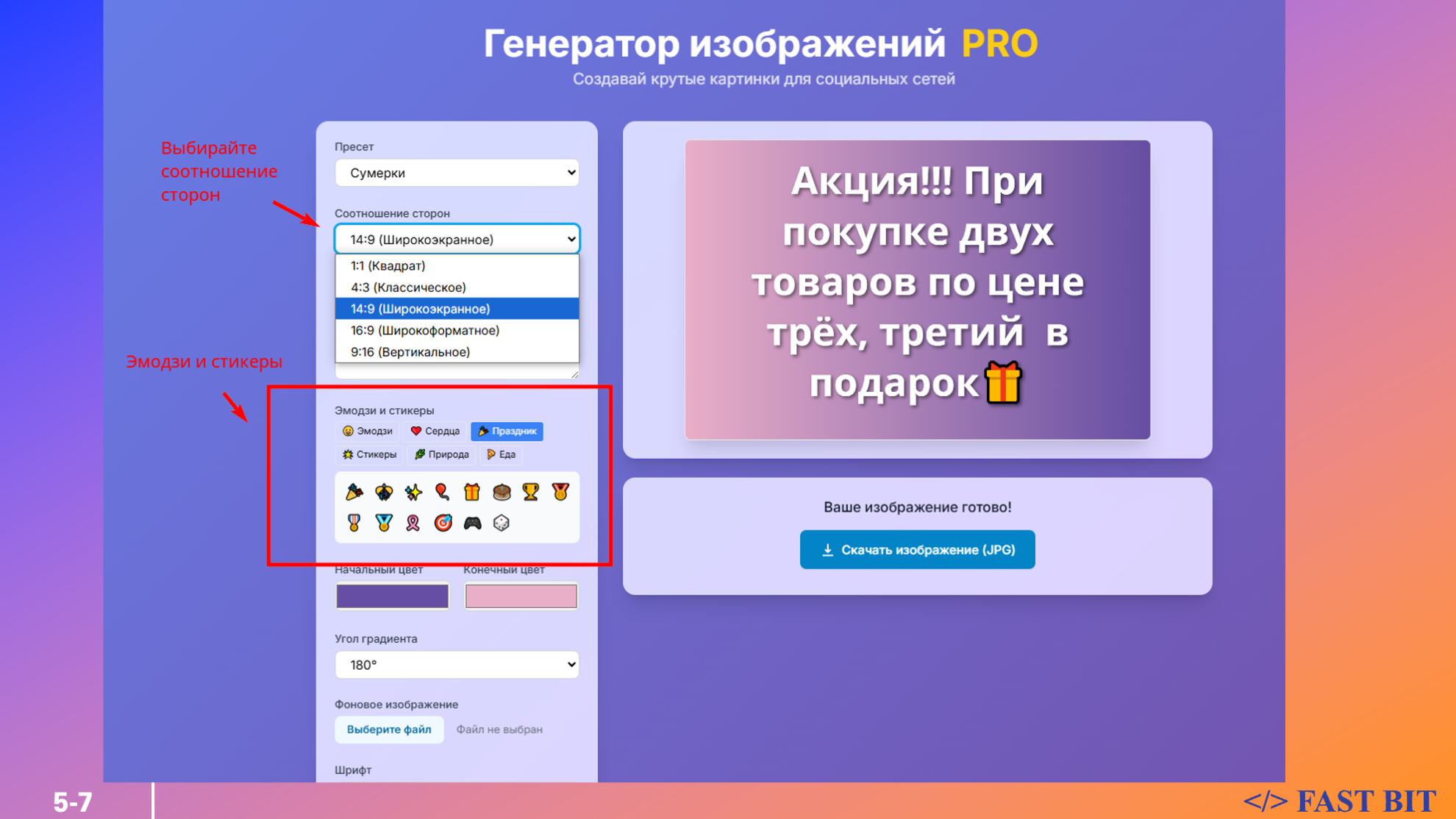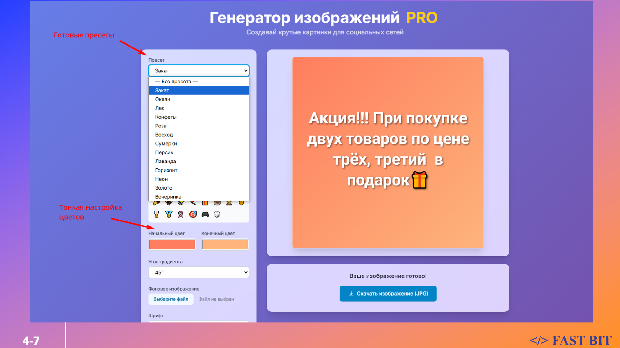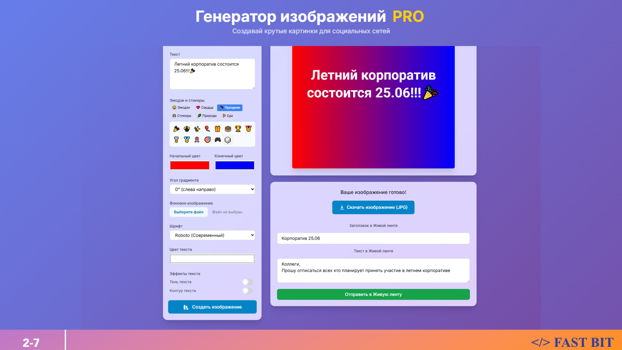 Генератор картинок для новостной ленты и социальных сетей— это ваш персональный дизайнер в пару кликов. Добавляйте текст, эмодзи, выбирайте градиенты, цветовые пресеты и форматы под любые соцсети.
