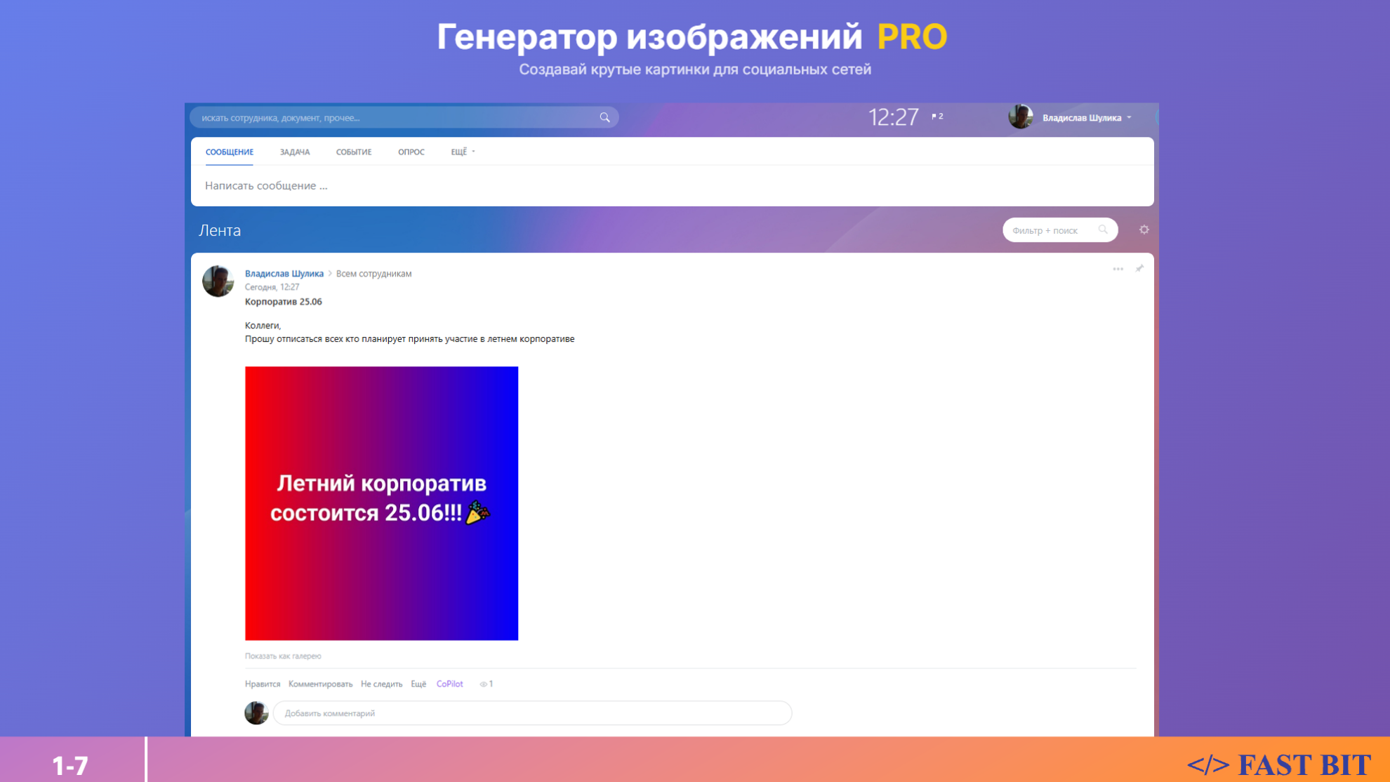 • Отправка сгенерированного сообщения в новостную ленту - например, для оповещения коллег о предстоящем мероприятии.