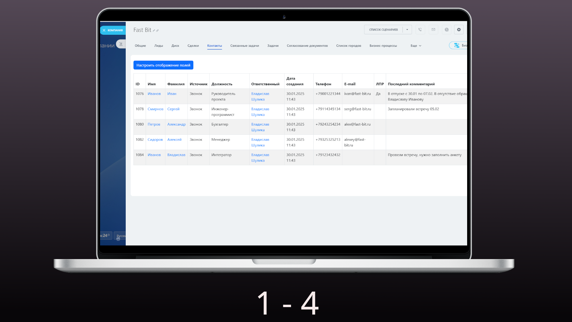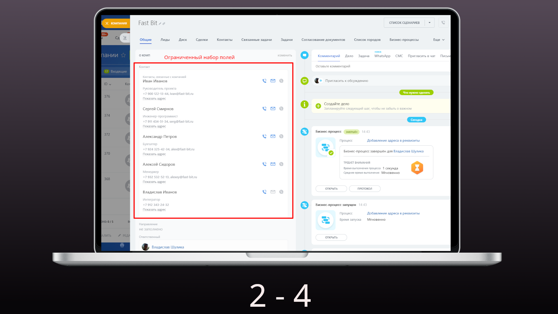 В карточке компании Битрикс24 есть штатное поле "Контакты", но оно предоставляет лишь базовую информацию. Это неудобно, если у компании много контактов и требуется видеть важные детали: дату последней активности, статус, тип, последний комментарий и другие ключевые параметры.