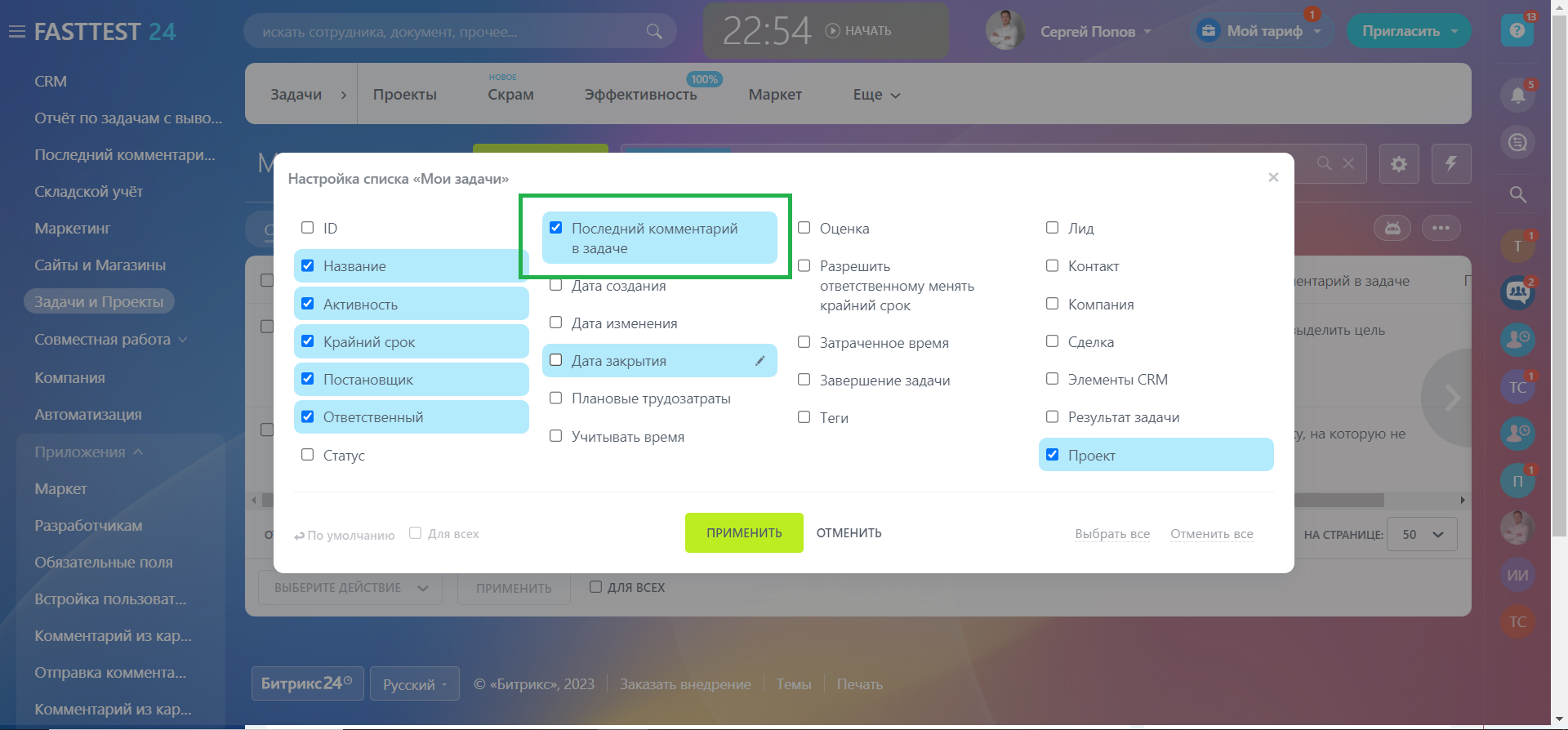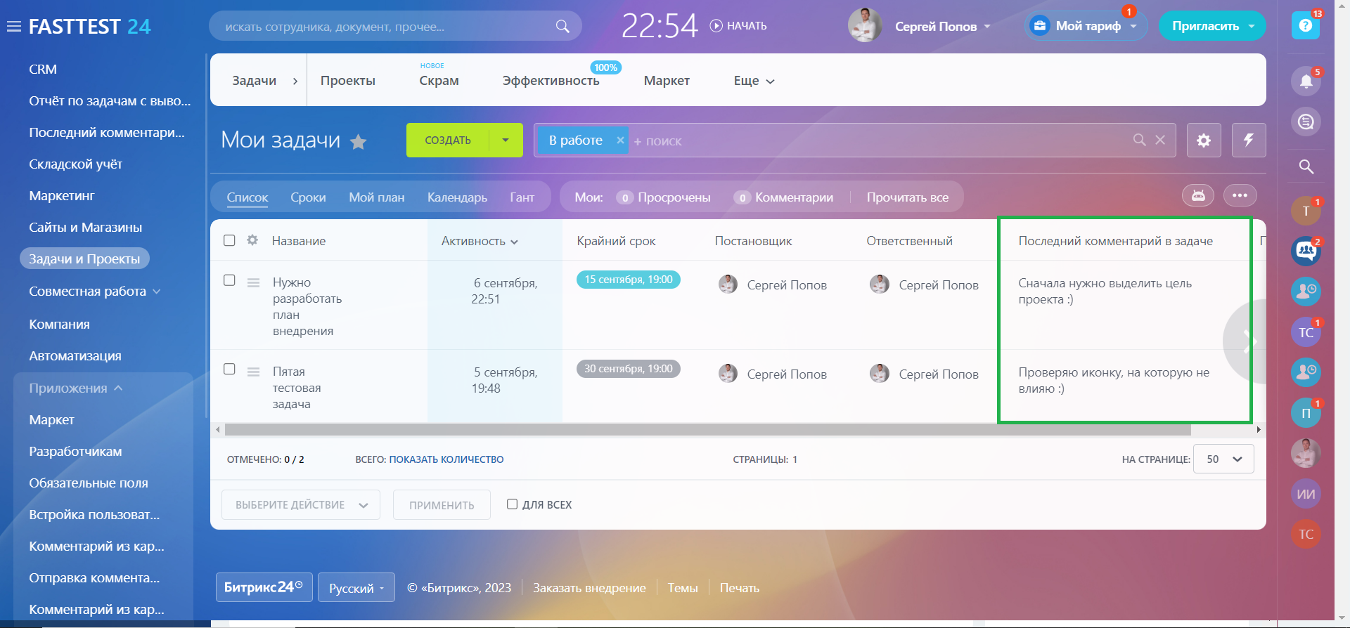 Создание пользовательского поля: Приложение автоматически создает пользовательское поле в карточке Задачи, предназначенное для хранения последнего комментария. Это поле интегрировано в стандартный интерфейс Битрикс24 и позволяет легко получать доступ к последнему обновлению или комментарию к задаче.