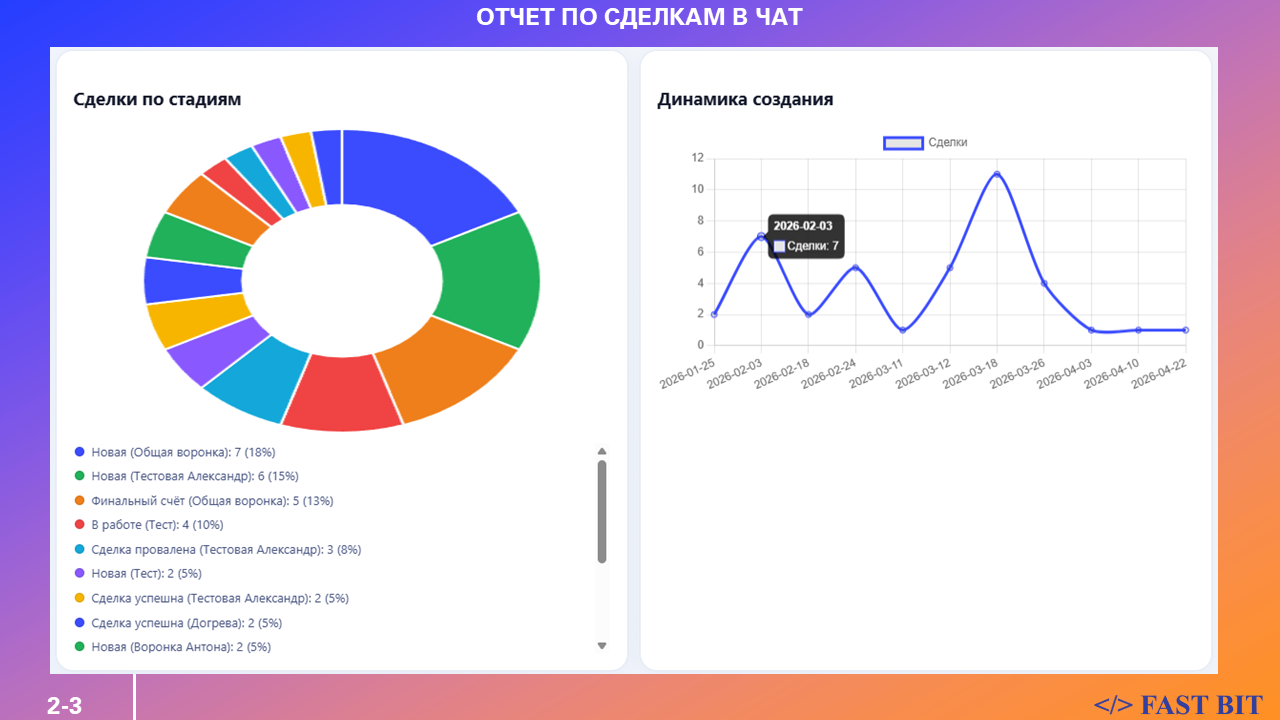 Для более удобного анализа данные представлены не только в цифрах. В отчете отображается круговая диаграмма по сделкам, которая позволяет быстро оценить распределение результатов, а также динамика создания сделок на временной шкале, чтобы видеть активность продаж за выбранный период.