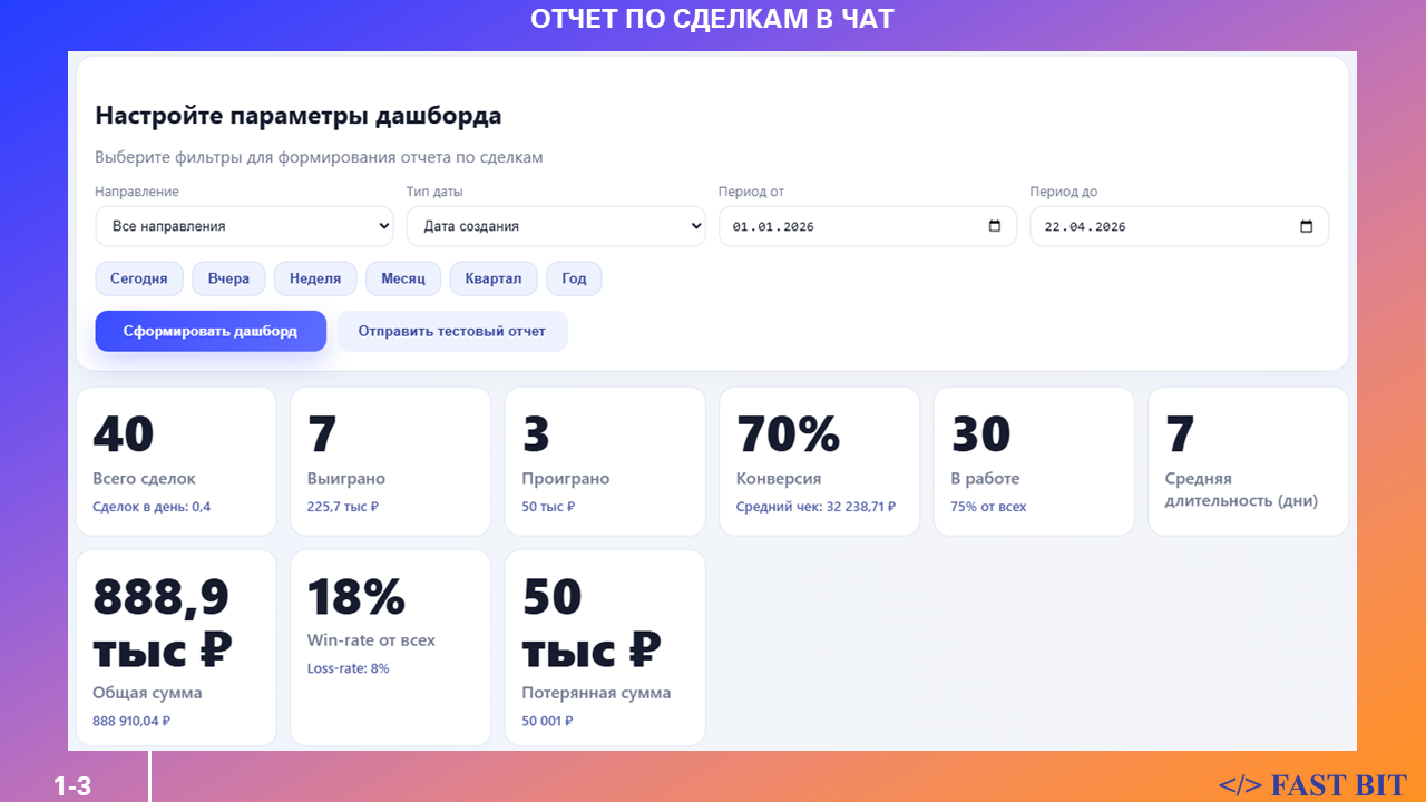 Приложение формирует отчет по сделкам за указанный период и показывает ключевые показатели, которые важны для оценки работы: всего сделок, выиграно, проиграно, конверсия, в работе, средняя длительность сделки в днях, общая сумма, win-rate от всех сделок и потерянная сумма.