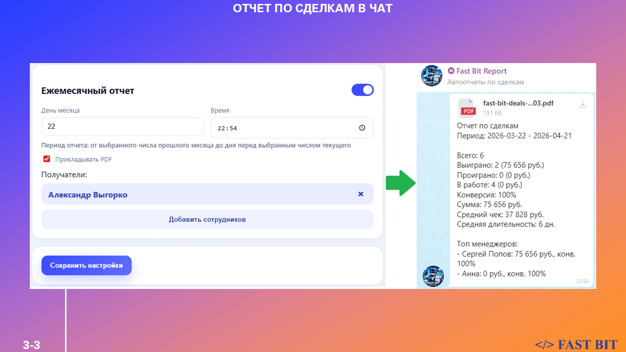 Отчет по Сделкам в чат подойдёт руководителям, РОПам и менеджерам по продажам, которым важно регулярно контролировать воронку, отслеживать результативность сотрудников и получать понятную аналитику по сделкам в одном месте.