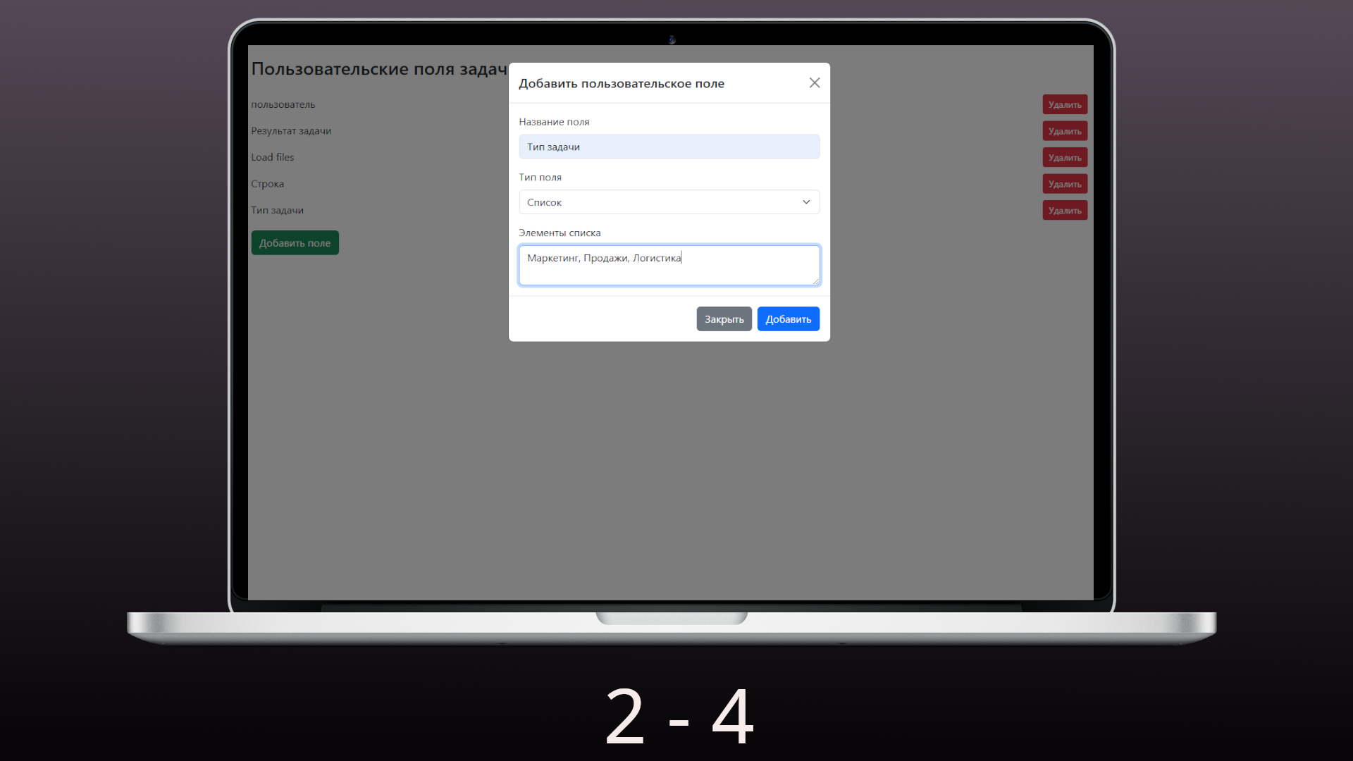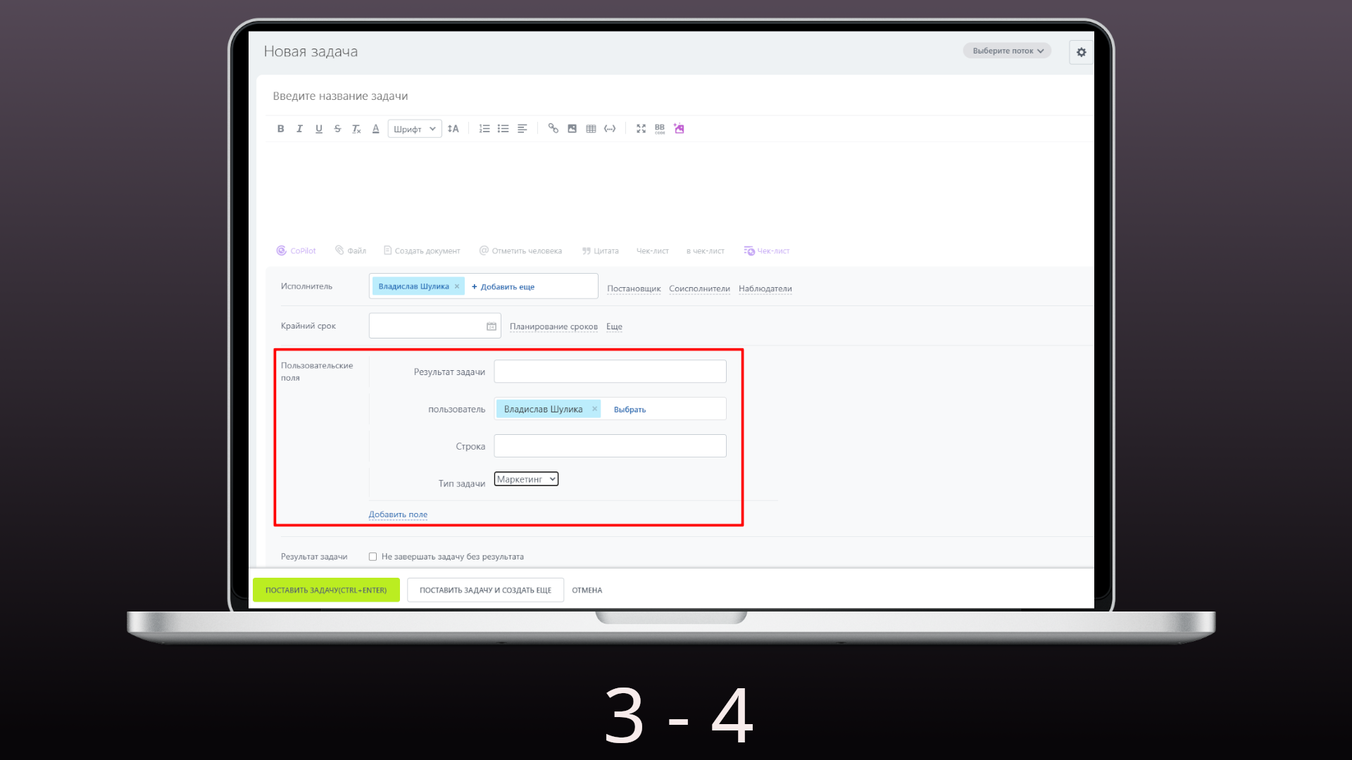 Приложение позволяет создавать и добавлять дополнительные пользовательские поля в задачи, чтобы адаптировать их под ваши бизнес-процессы.
