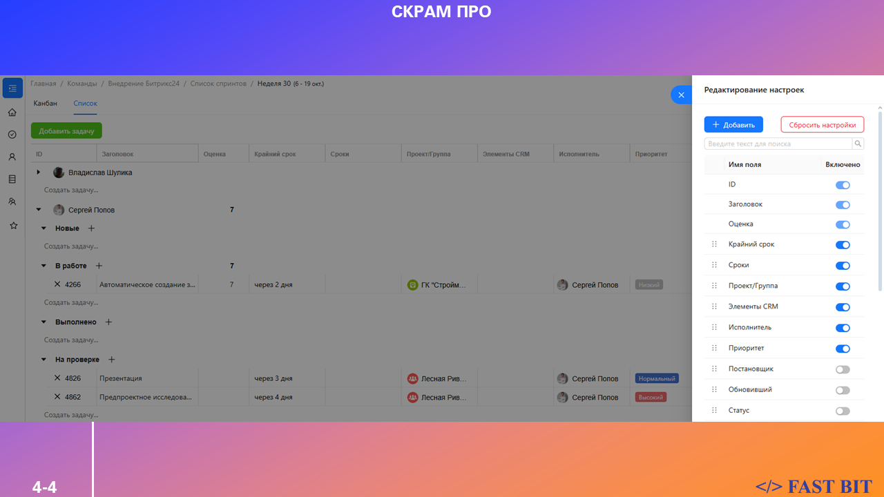 - Входит в подписку Fast Bit ПРО, которая открывает доступ не только к Скрам ПРО, но и к другим решениям серии ПРО: Проекты ПРО, Смарт-Процессы ПРО и другие.