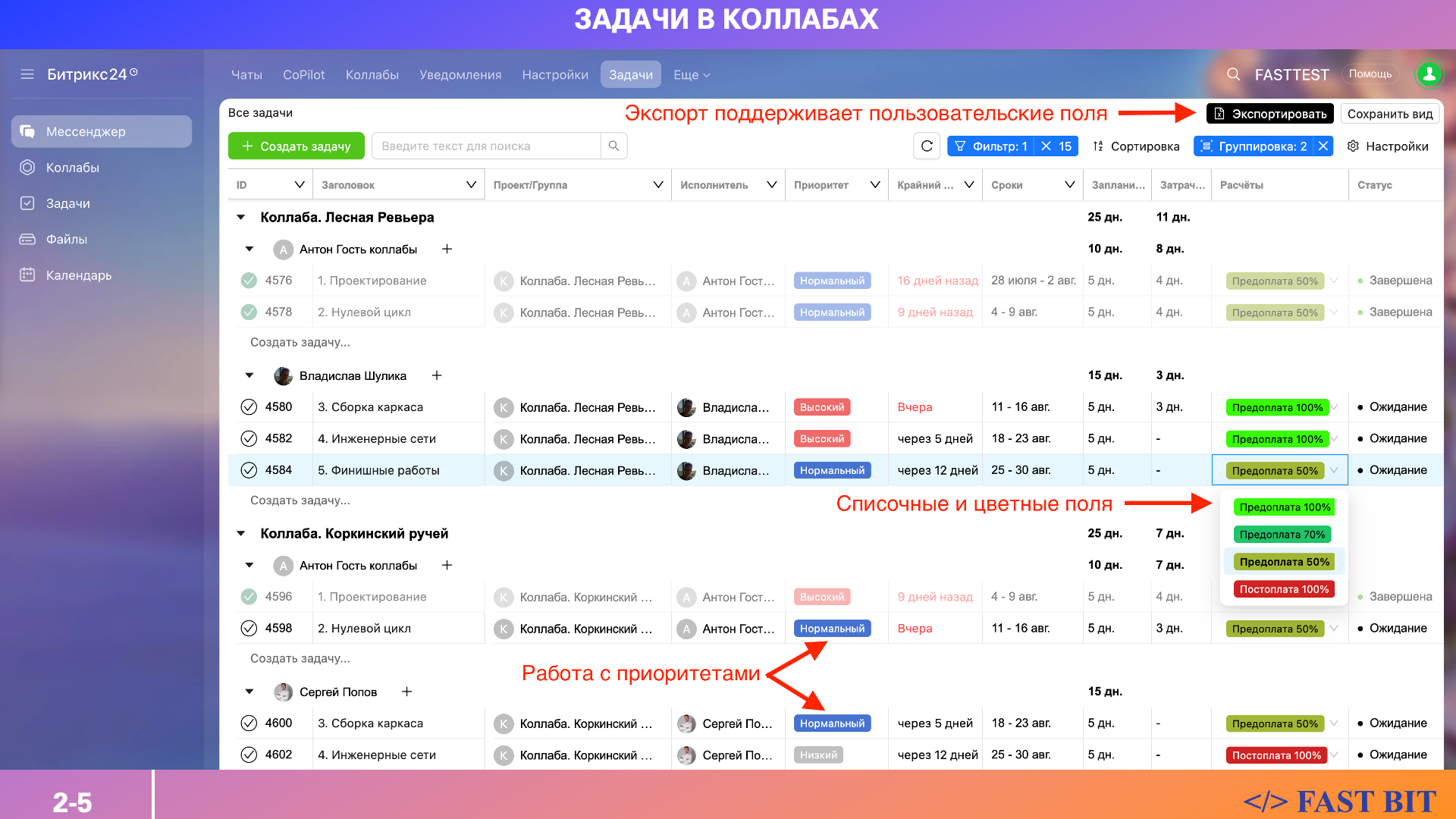 • стандартные поля (статус, крайний срок, ответственное лицо и др.),