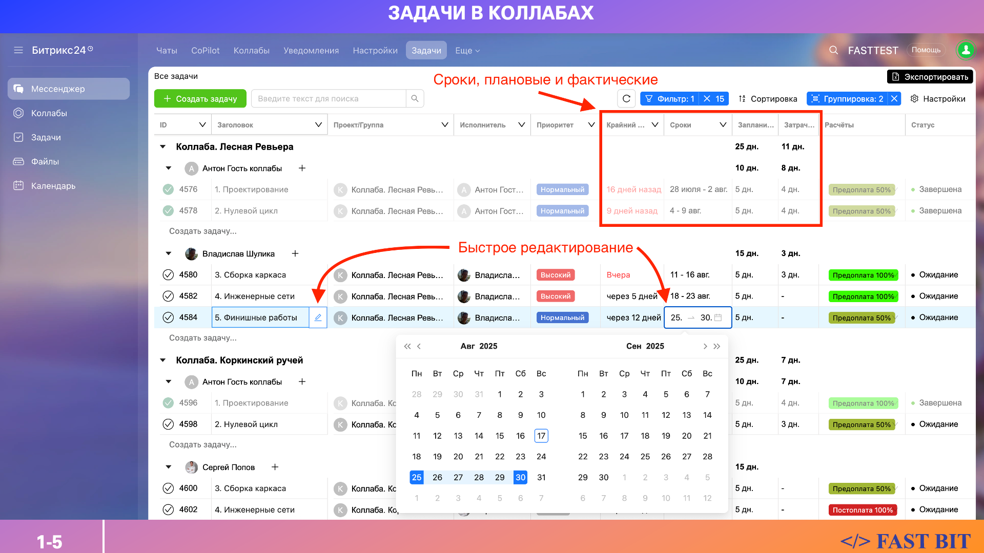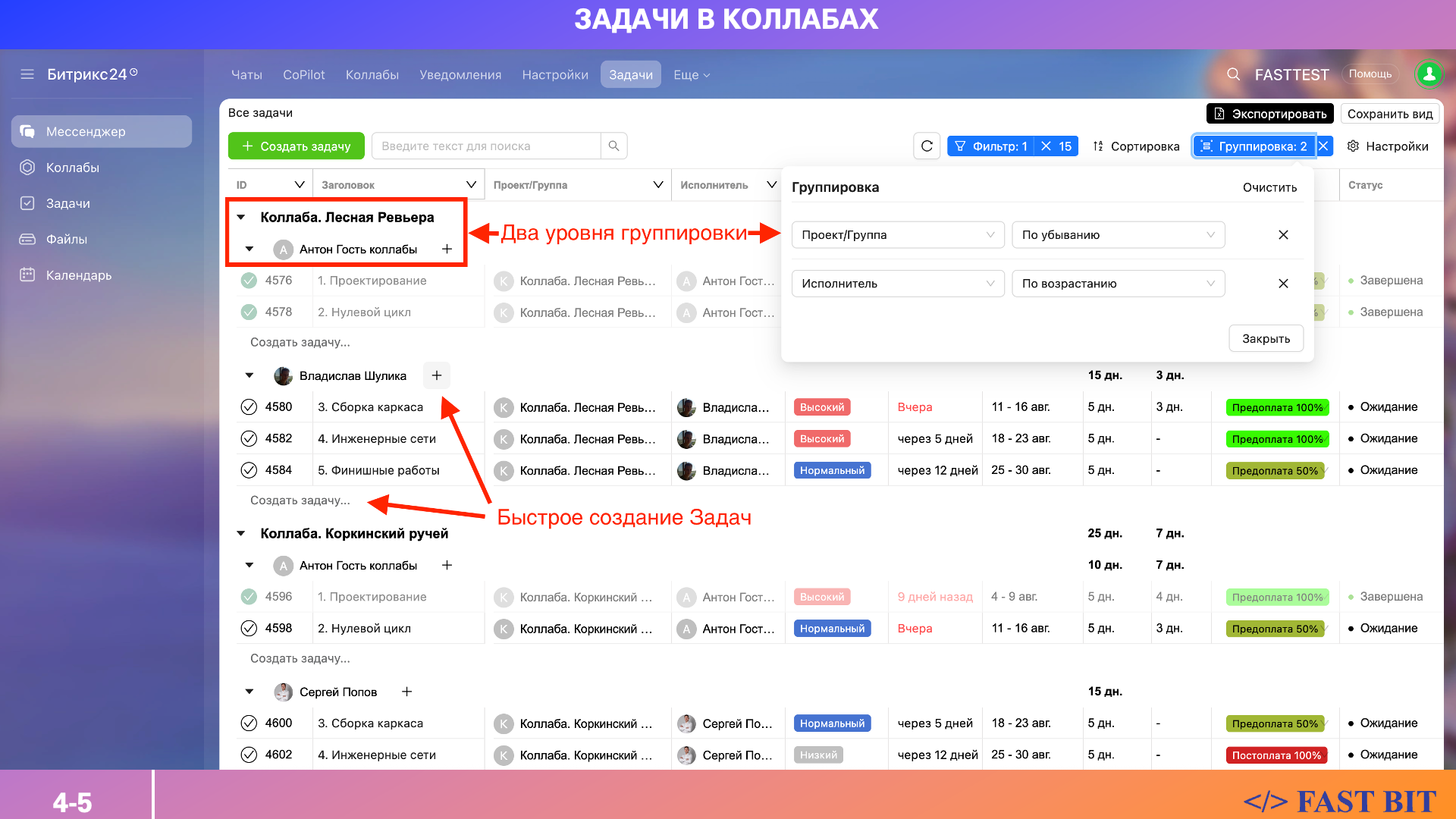 Онлайн создание и редактирование задач прямо в Коллабе в режиме списка задач (Grid-режим).