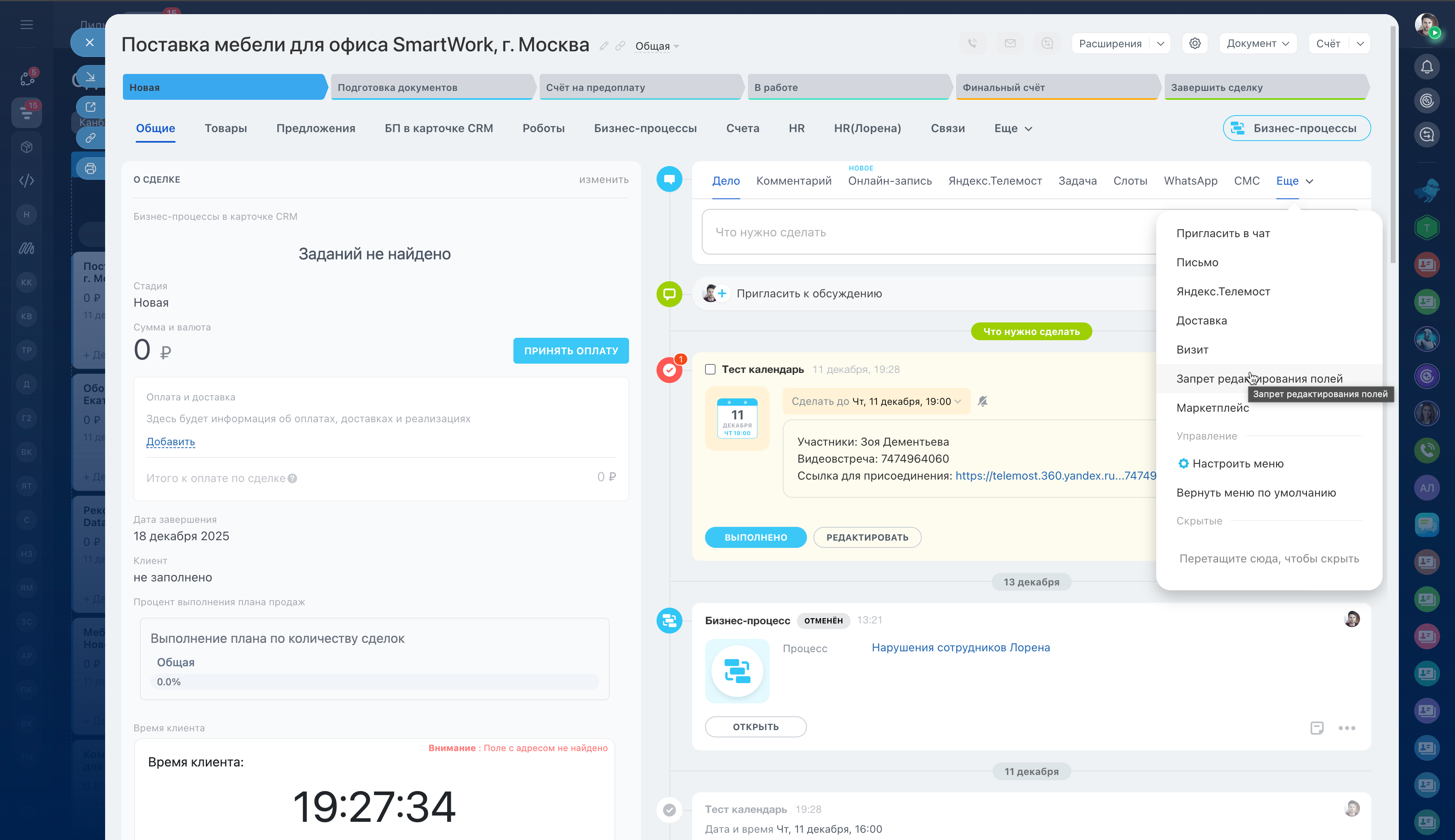 Приложение Telemost позволяет создавать и планировать онлайн-встречи и конференции прямо из карточки сделки CRM, в Задачах, в разделе Автоматизация Битрикс24. Назначать и планировать видеовстречи можно из кнопки Процессы, история отображаются на таймлайне в сделке.