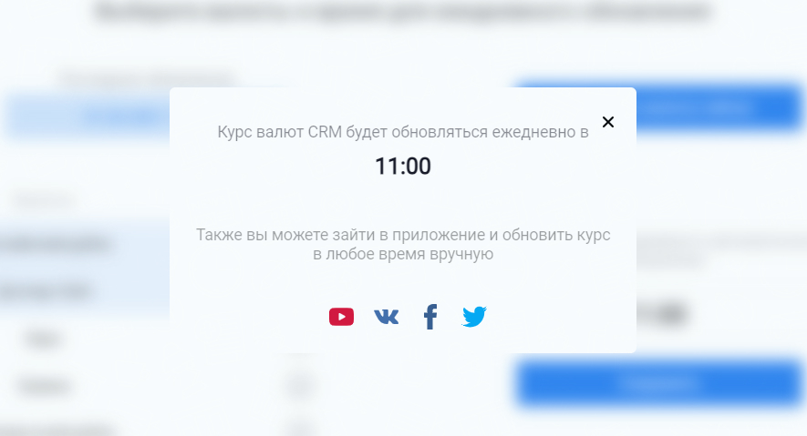 При запуске приложения Вам будут показаны валюты, которые вы добавляете в настройках валют(CRM->Настройки->Валюты). Приложение предлагает вам выбрать валюты, которые необходимо обновлять и установить время для ежедневного обновления.