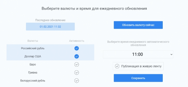 Приложение ежедневно в указанное время обновляет курсы Ваших валют в CRM и публикует в живую ленту.