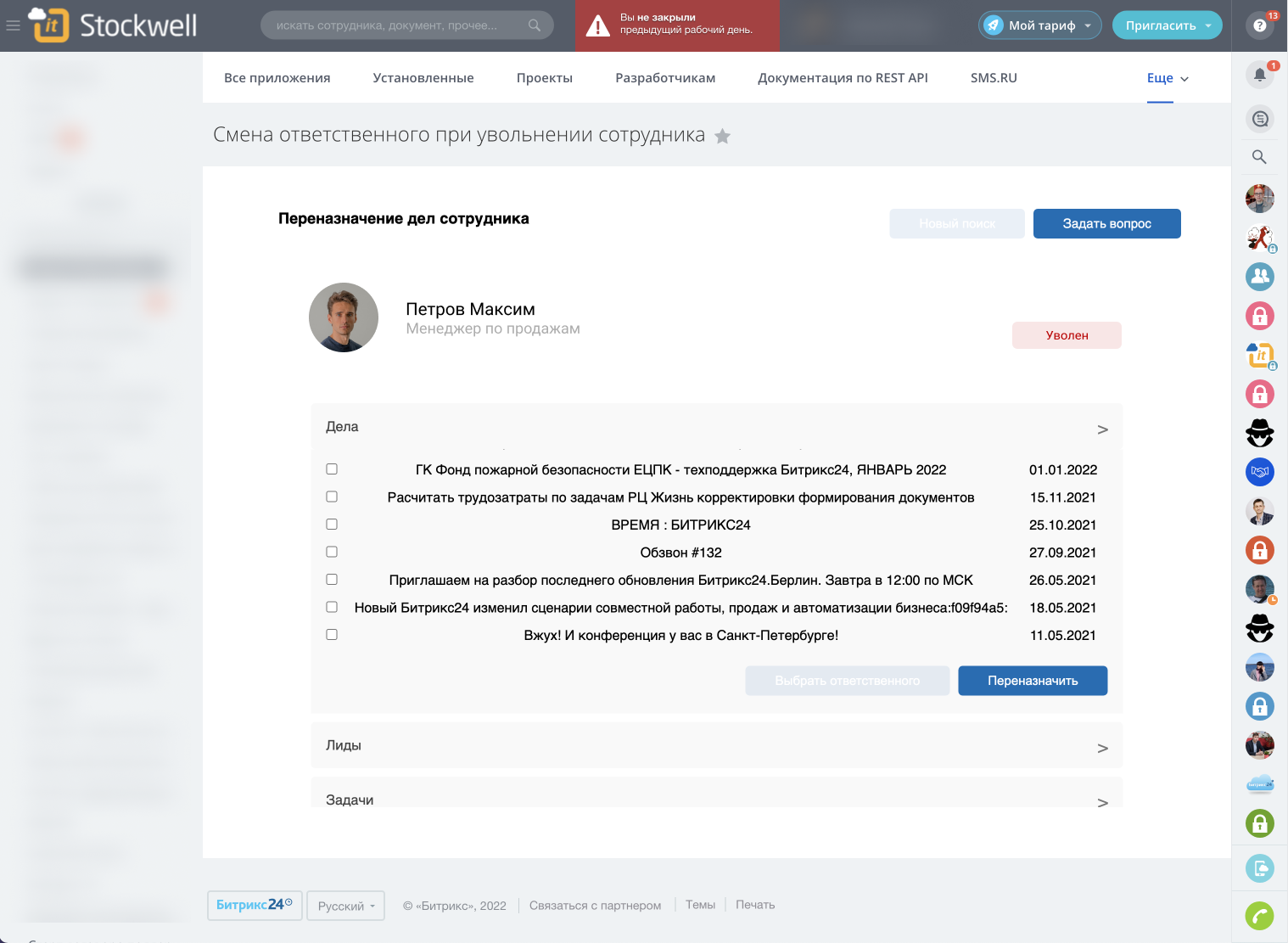Приложение позволяет быстро сменить ответственного за сделки, контакты, компании, лиды.