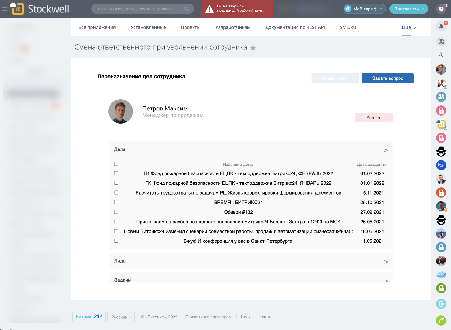 Cделки и Лиды - Отбираются все сделки и лиды, если сотрудник уволен, если сотрудник не уволен, то отбираем все "В работе"