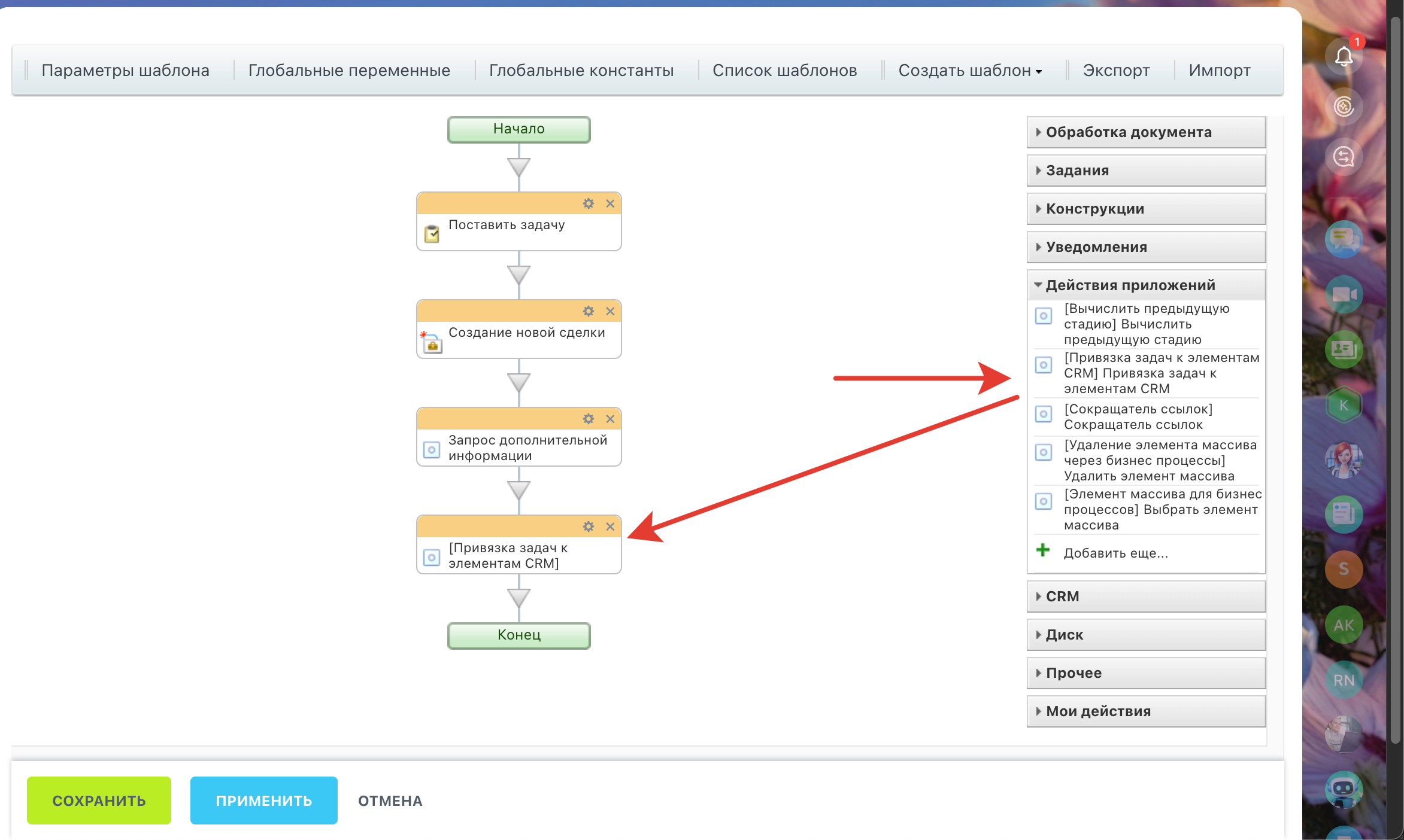 После выполнения задачи сделка автоматически переходит на следующую стадию.