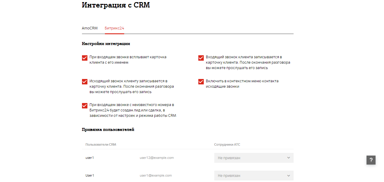 4. После успешной авторизации вы будете перенаправлены на страницу «Интеграция с СRM» в веб-интерфейсе управления Виртуальной АТС А1, где сможете установить соответствие между сотрудниками ВАТС и пользователями CRM и настроить необходимые опции интеграции.