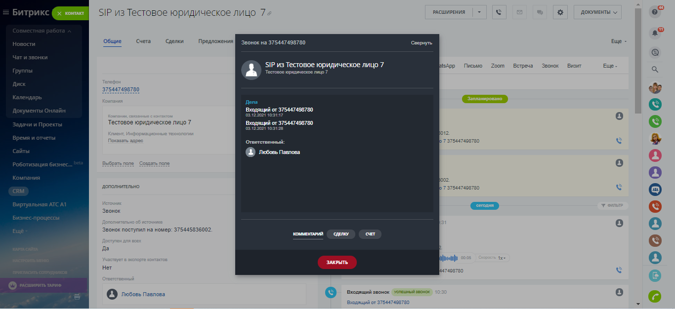 3. Создание контакта для неизвестного номера напрямую из карточки входящего звонка.