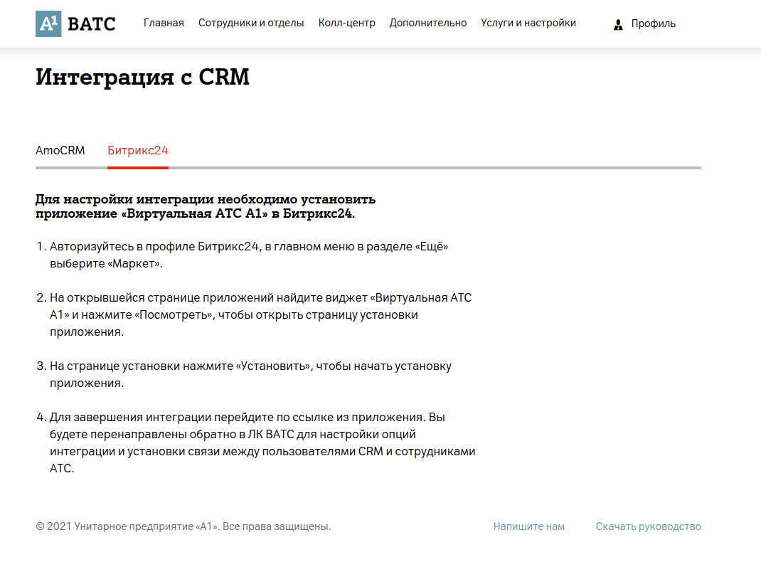 Приложение для интеграции с Виртуальной АТС А1 и доступа к ряду удобных надстроек Битрикс24 (исходящие звонки через АТС, уведомления о входящих звонках и пр.)