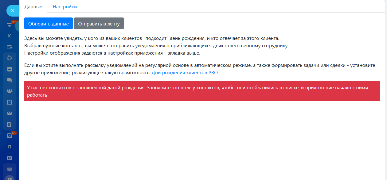 Для просмотра информации зайдите в приложение (пункт меню "Дни рождения клиентов"). Для отправки информации в живую ленту нажмите соответствующую кнопку. В настройках вы можете указать текст для публикации в ленте, а также за какое количество дней до ДР показывать контакты.