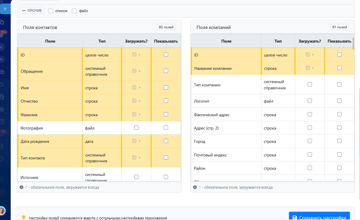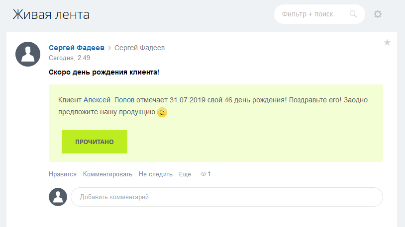 Показывает наступающие дни рождения контактов CRM. Информация также может публиковаться в ленте ответственных сотрудников.