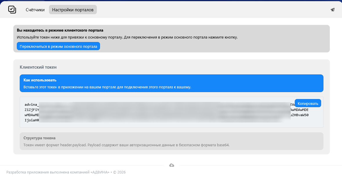 Режим «Основной портал»: В этом режиме вы управляете подключениями, добавляете клиентские порталы и видите сводную панель со всеми счётчиками. При этом сам этот портал также может выступать в роли «клиентского» для другого основного портала — архитектура многоуровневая и гибкая.