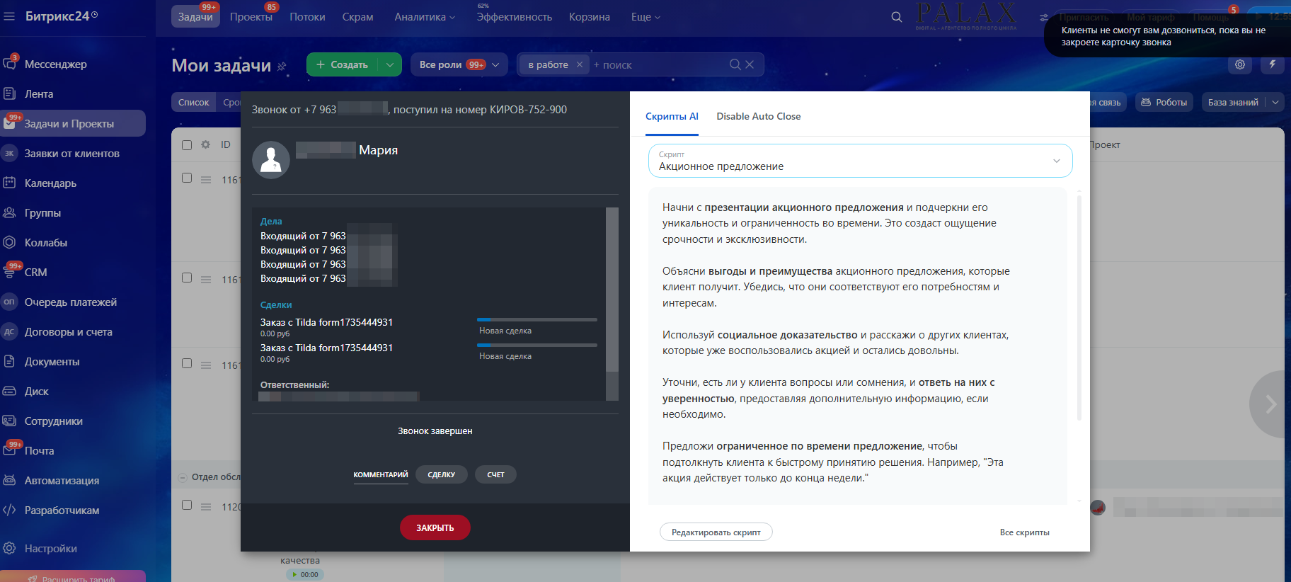 Когда приложение запускается в контексте окна звонка, оно активирует режим, который помогает сохранить окно звонка открытым на время обработки разговора. Благодаря этому сотрудник может корректно зафиксировать результат общения и выполнить нужные действия без риска потерять важную информацию.