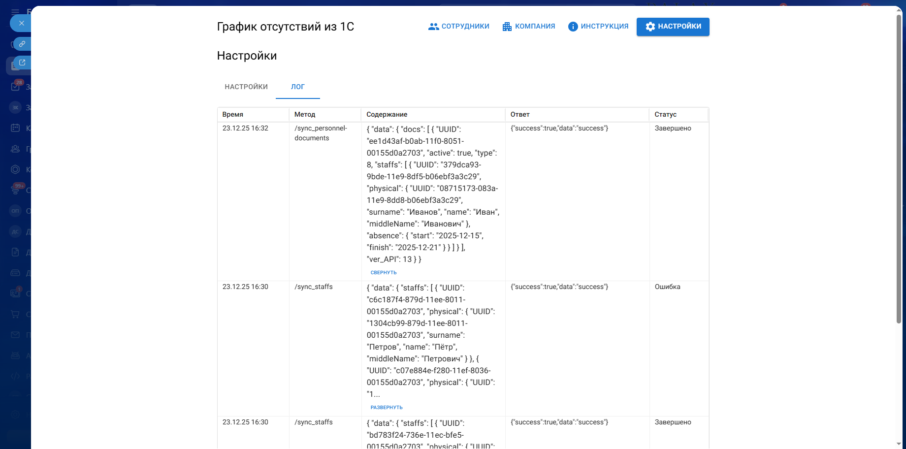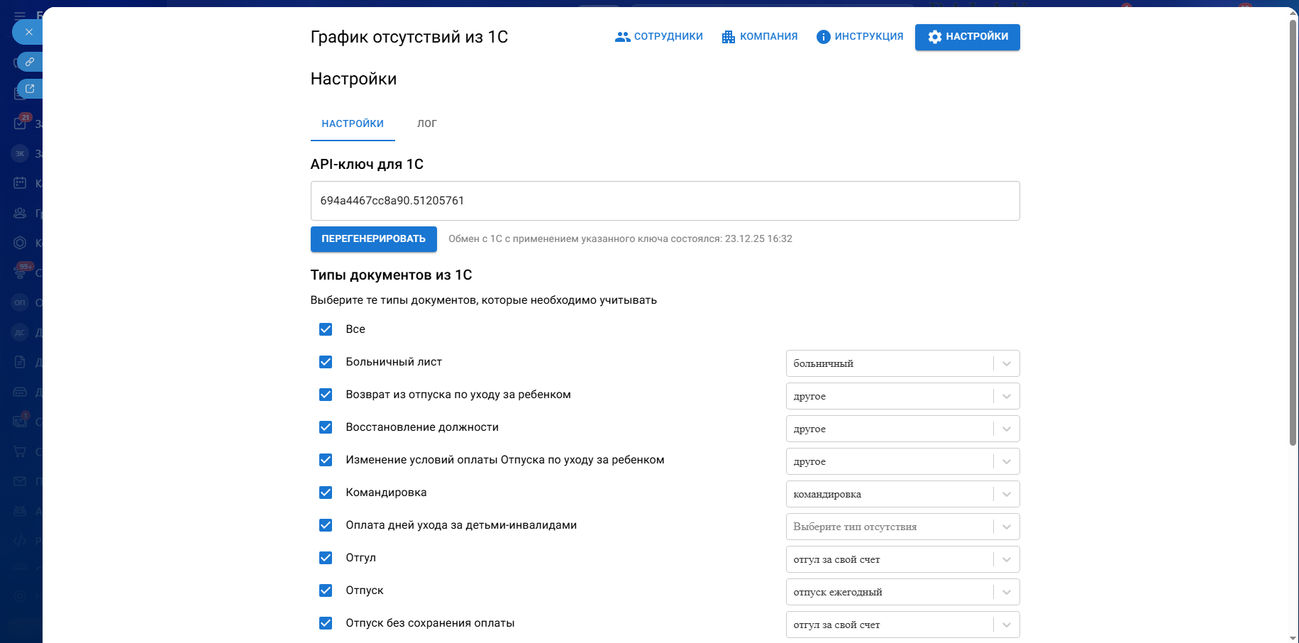 Перенос отпусков, больничных и др. из 1С в график отсутствий