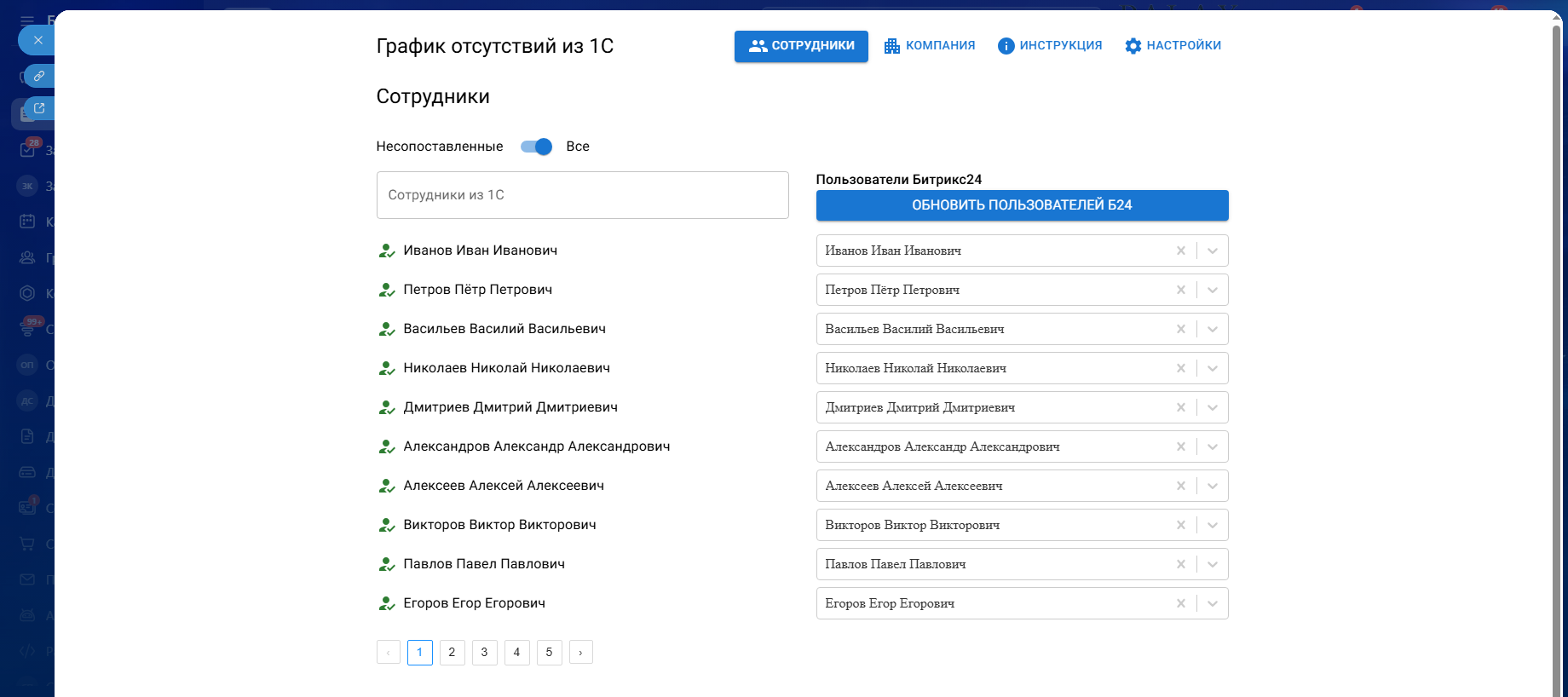• автоматически передавать данные об отпусках и отсутствиях из 1С в Битрикс24;
