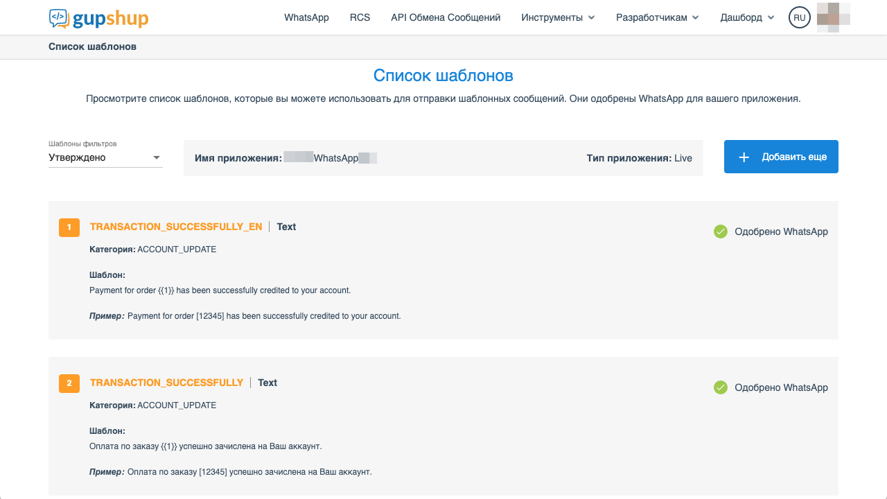- Создание шаблонов исходящих сообщений. Для возможности написать пользователю первым, можно создать необходимые шаблоны и отправить их на одобрение в WhatsApp.