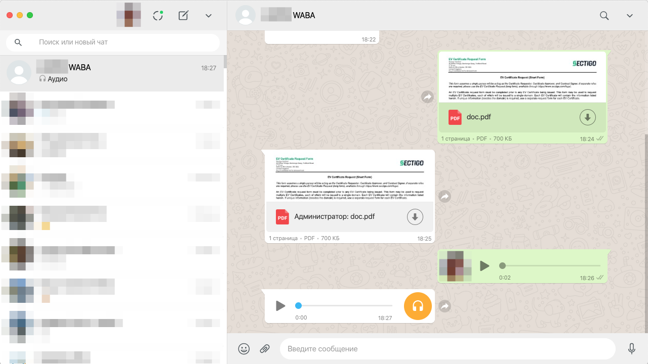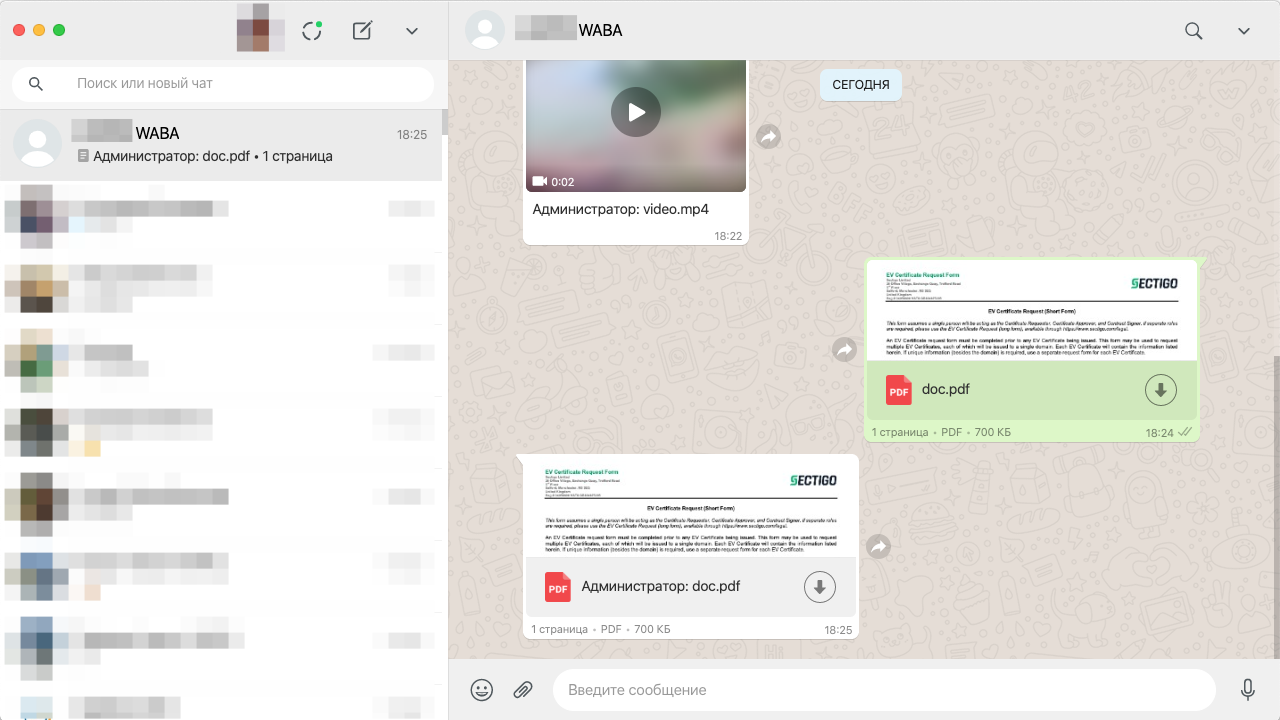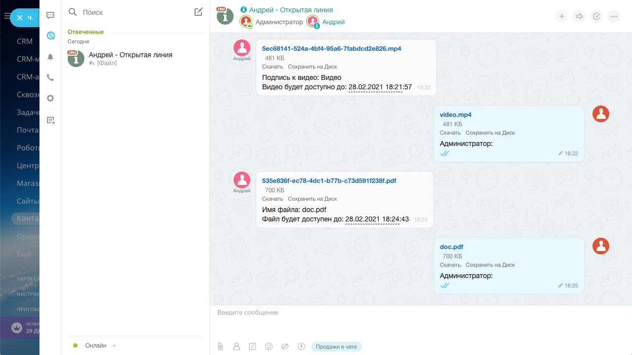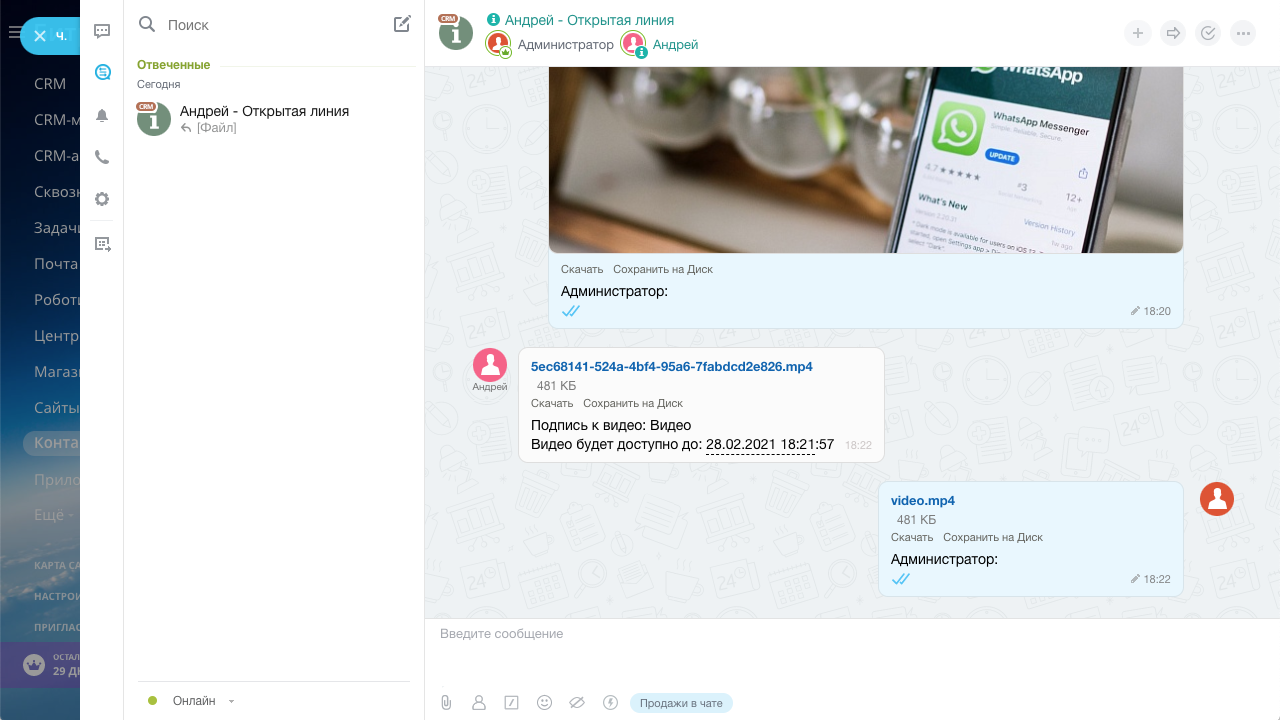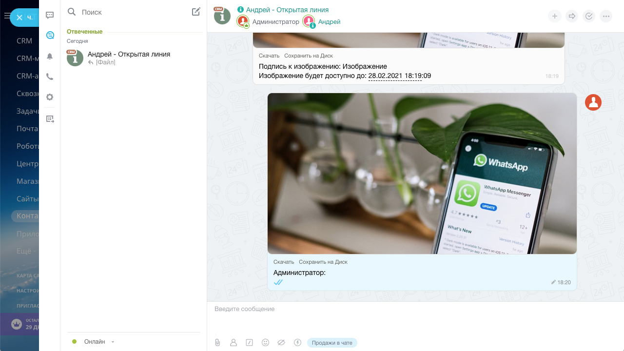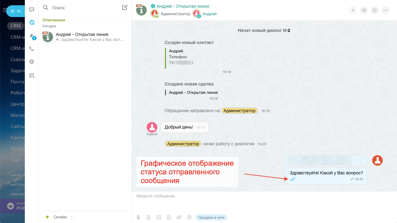 - Графическое отображение статусов отправленных сообщений. После отправки сообщений из открытой линии пользователю в WhatsApp, в чате открытой линии будут отображаться их статусы, такими же графическими иконками, как и в WhatsApp: "Отправляется", "Отправлено", "Доставлено", "Прочитано".