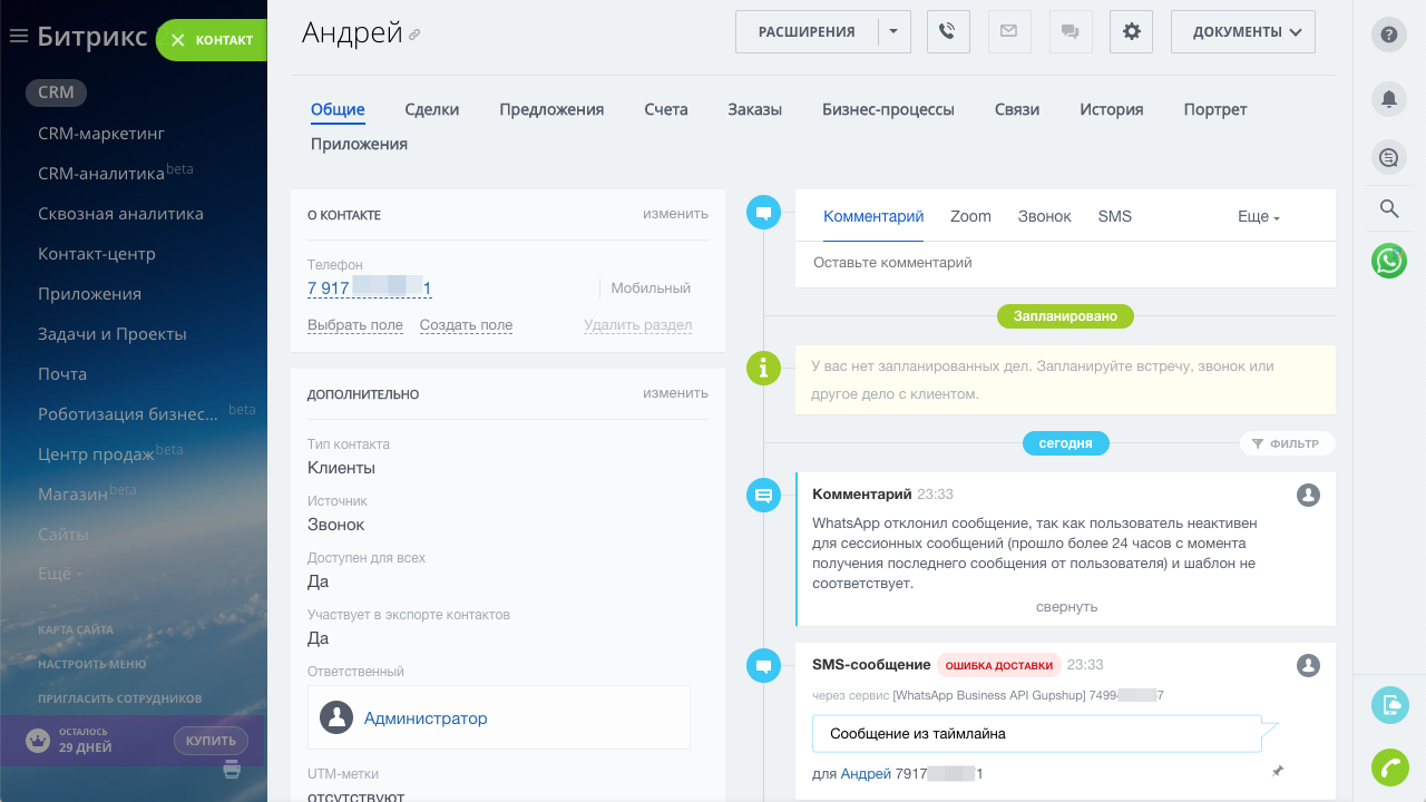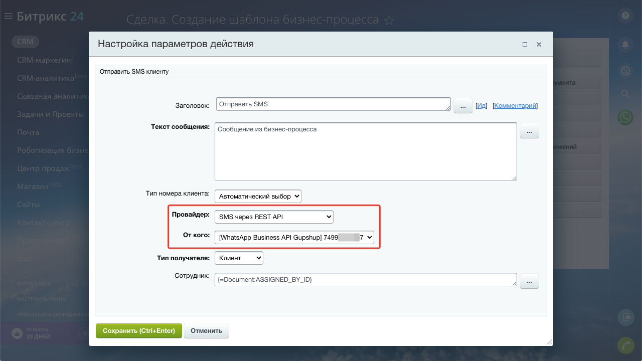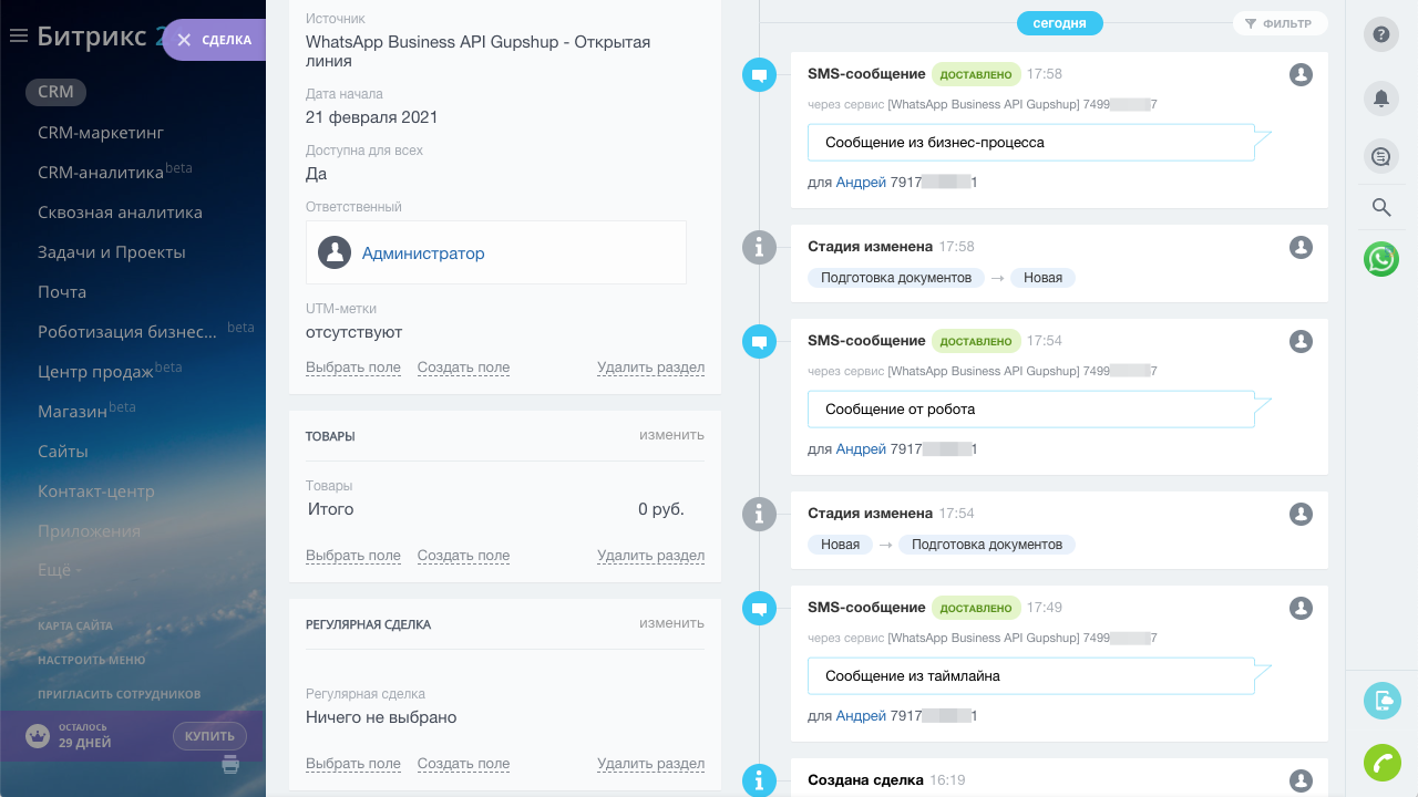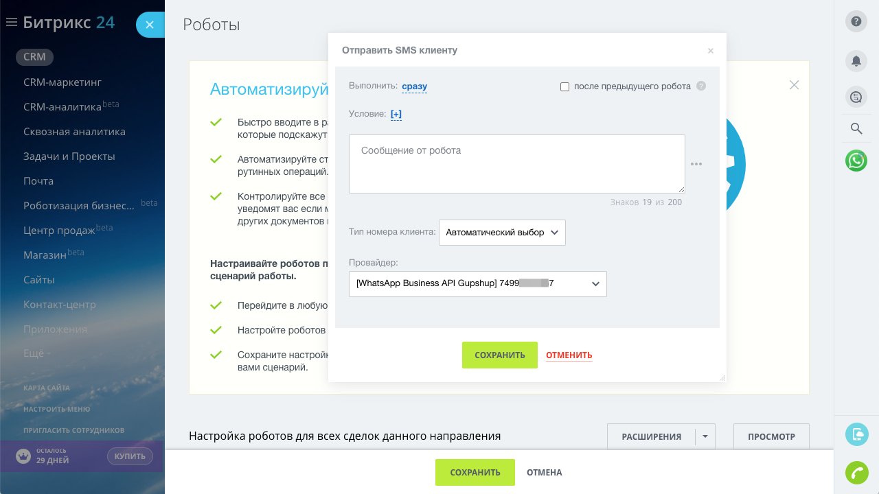 - Автоматизация отправки сообщений в WhatsApp. При установке приложения, в Битрикс24 автоматически создается новый SMS-провайдер, только при этом отправляются не SMS, а сообщения в WhatsApp. Отправка осуществляется как вручную, так и автоматически из любого места CRM: из роботов, бизнес-процессов, SMS и Мессенджер рассылок из раздела CRM-маркетинг, таймлайна Лидов, Сделок, Контактов и Компаний.