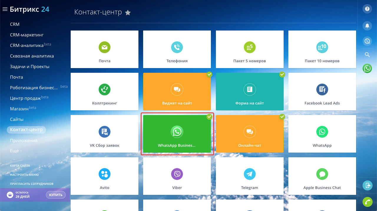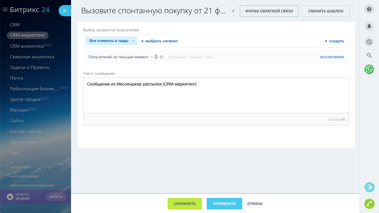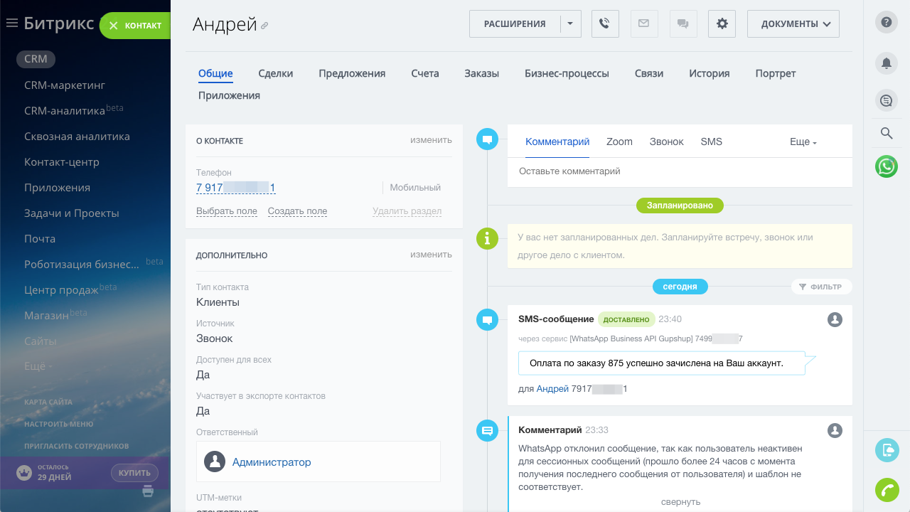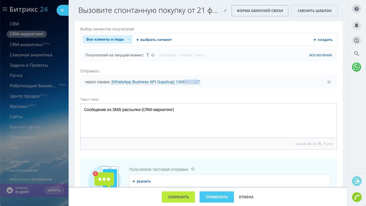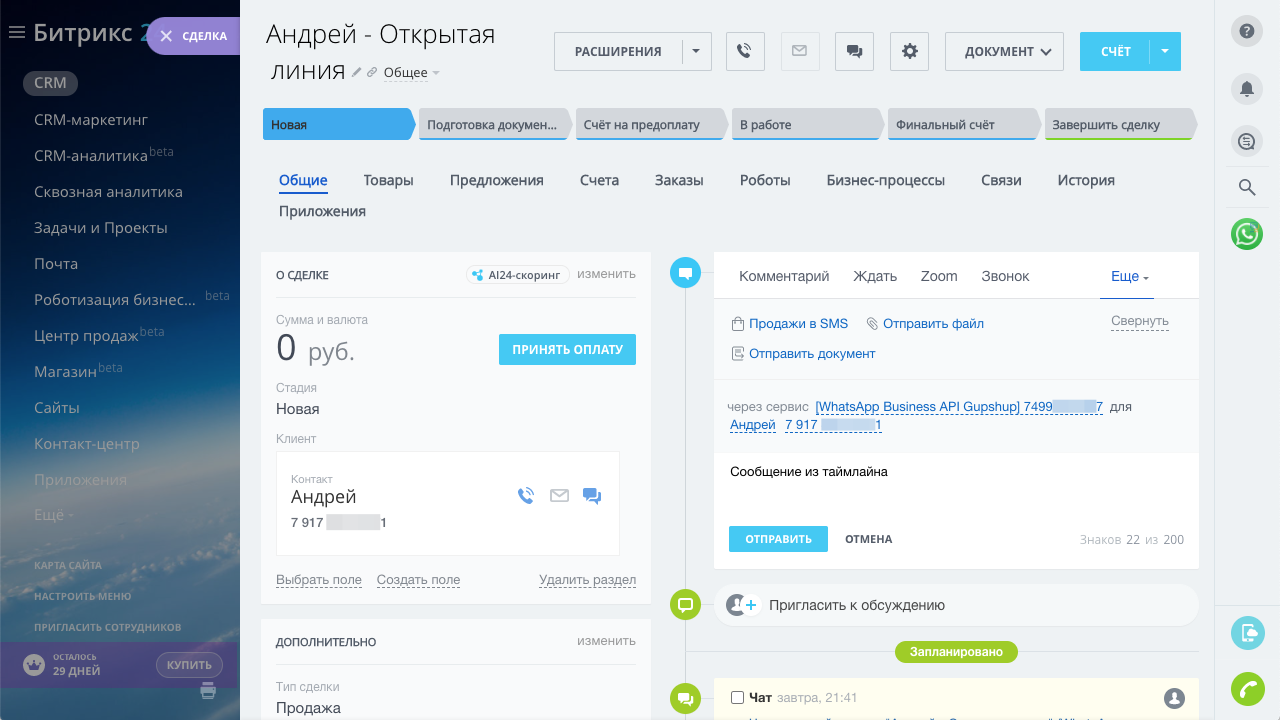 - Автоматизация отправки сообщений в WhatsApp. При установке приложения, в Битрикс24 автоматически создается новый SMS-провайдер, только при этом отправляются не SMS, а сообщения в WhatsApp. Отправка осуществляется как вручную, так и автоматически из любого места CRM: из роботов, бизнес-процессов, SMS и Мессенджер рассылок из раздела CRM-маркетинг, таймлайна Лидов, Сделок, Контактов и Компаний.