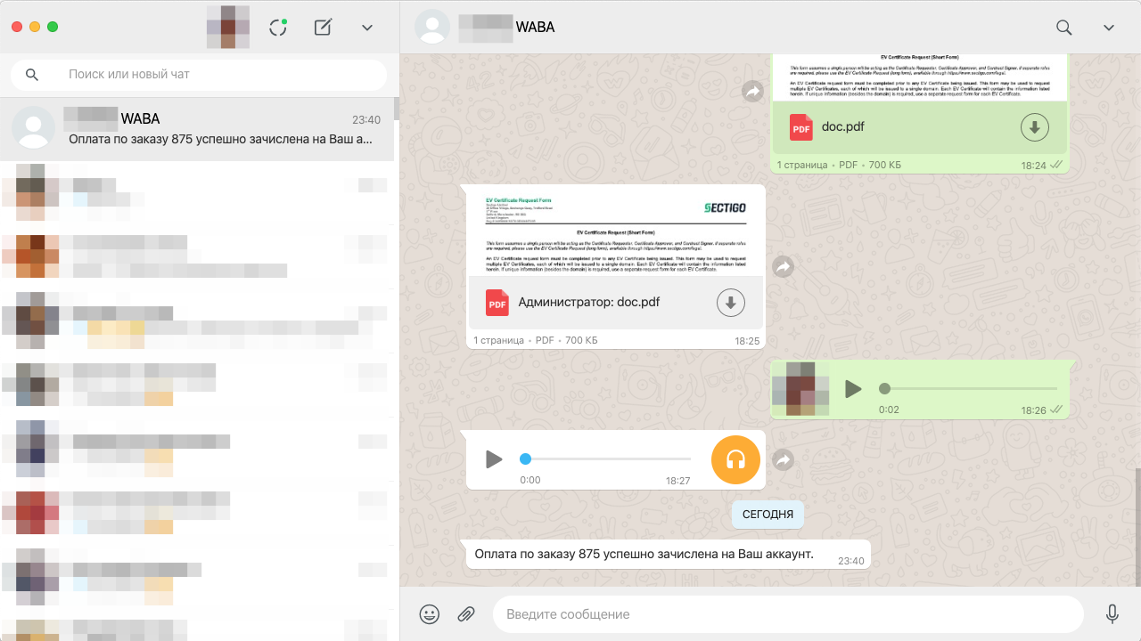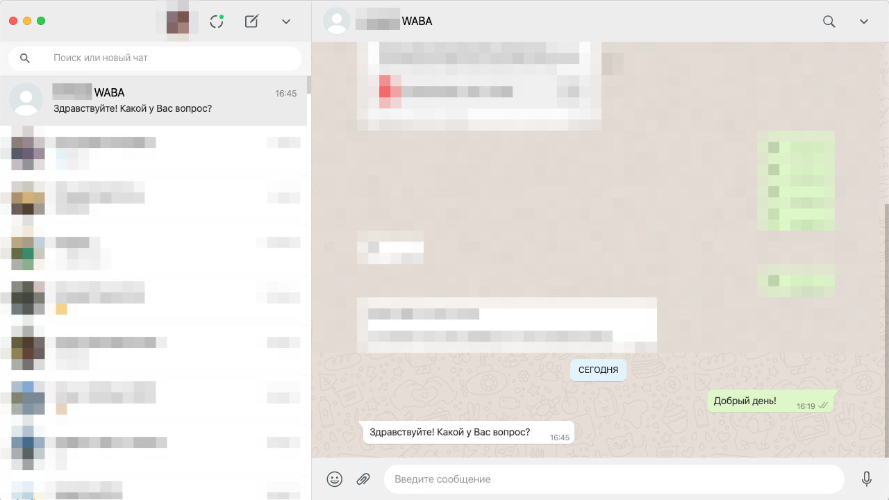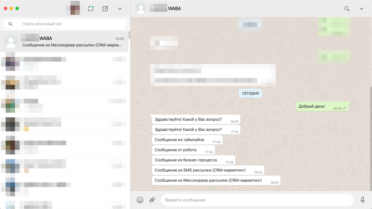 - Есть возможность написать пользователю первым. Предварительно подготавливаются специальные шаблоны сообщений по правилам WhatsApp. После их одобрения со стороны WhatsApp, сообщения по данным шаблонам можно отправлять пользователям в любое время.