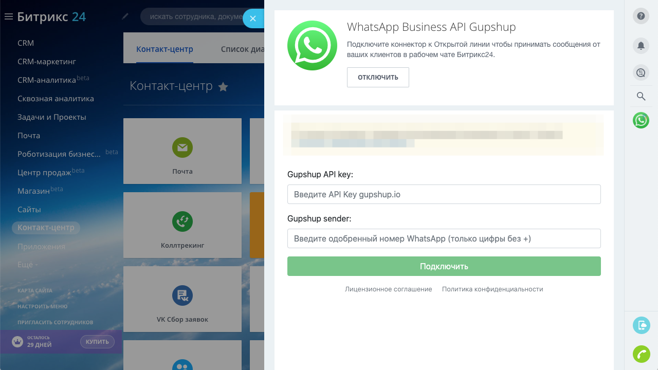 Приложение WhatsApp Business API Gupshup представляет собой Коннектор для подключения официального WhatsApp Business API к Открытым линиям Битрикс24 через сервис Gupshup.
