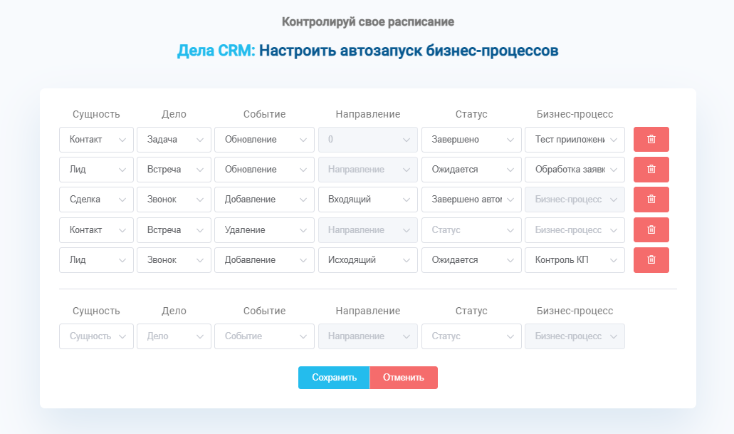 Автоматический запуск бизнес-процессов: ⁃ при завершении звонка менеджером, ⁃ при завершении задачи ⁃ при удалении дел (звонков, задач, встреч и пр) ⁃ в делах, ⁃ лидах, ⁃ сделках, ⁃ контактах.