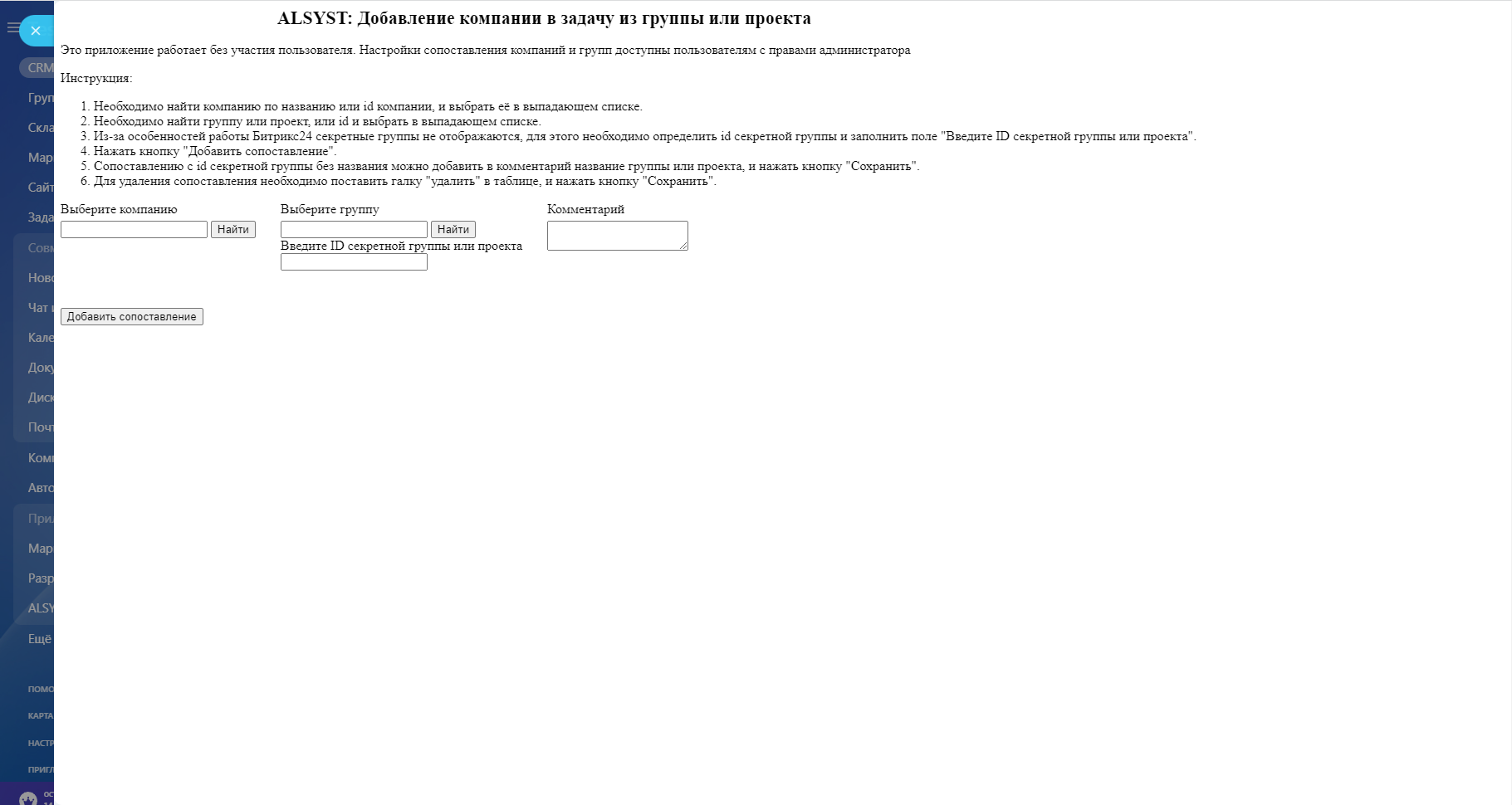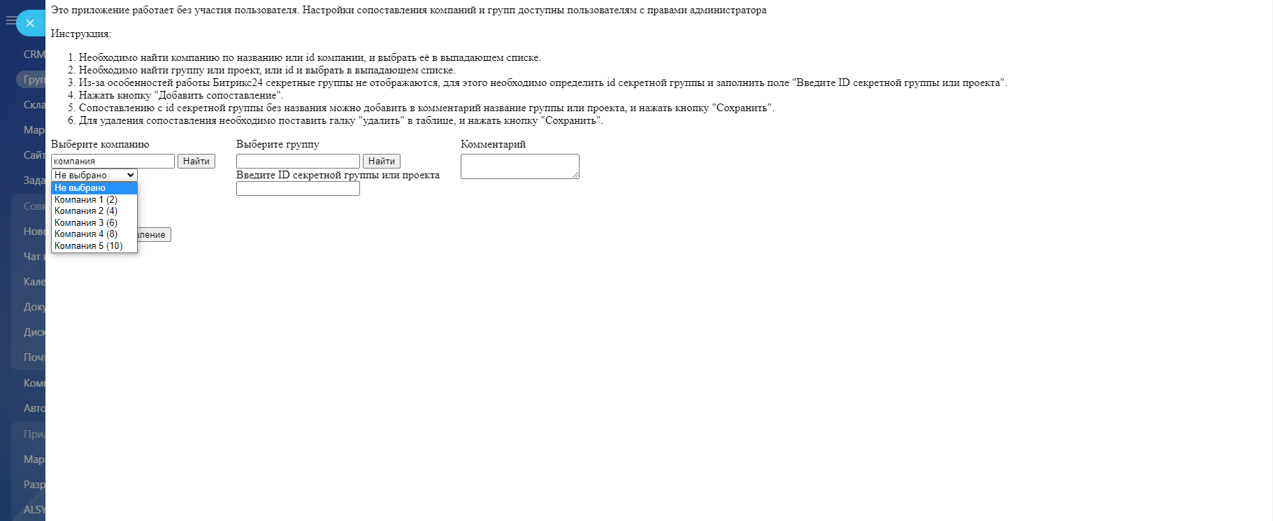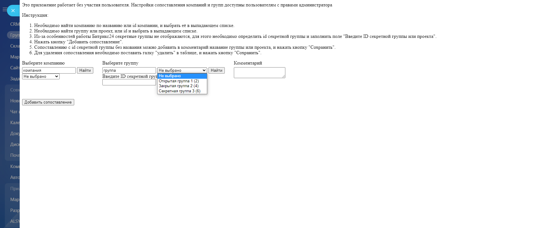 - Из-за особенностей работы Битрикс24 секретные группы не отображаются, для этого необходимо определить id секретной группы и заполнить поле "Введите ID секретной группы или проекта".