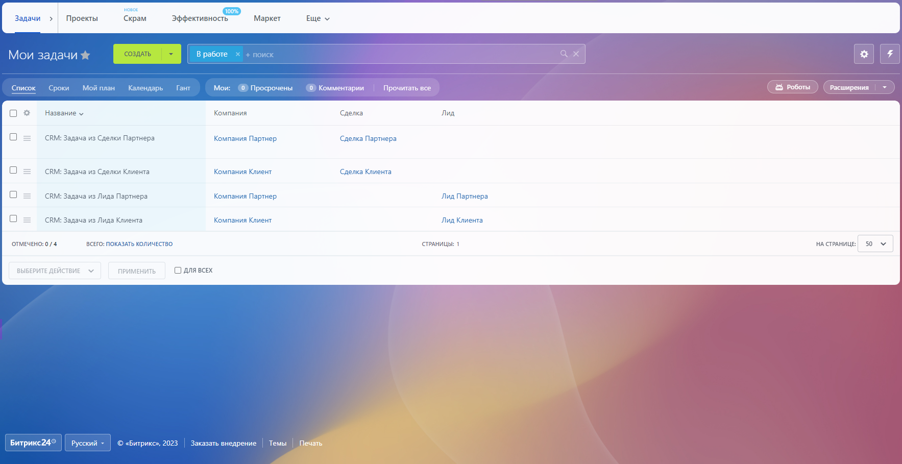 Это поможет вам отфильтровывать задачи по компаниям или отобразить связи и со Сделками и Лидами, и с Компаниями при отображении списка задач.