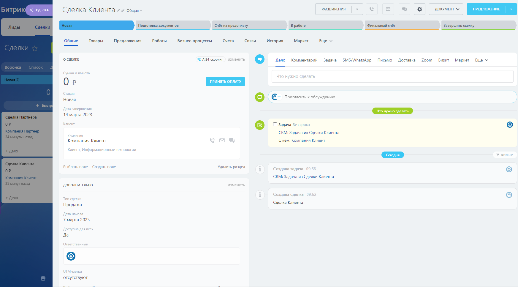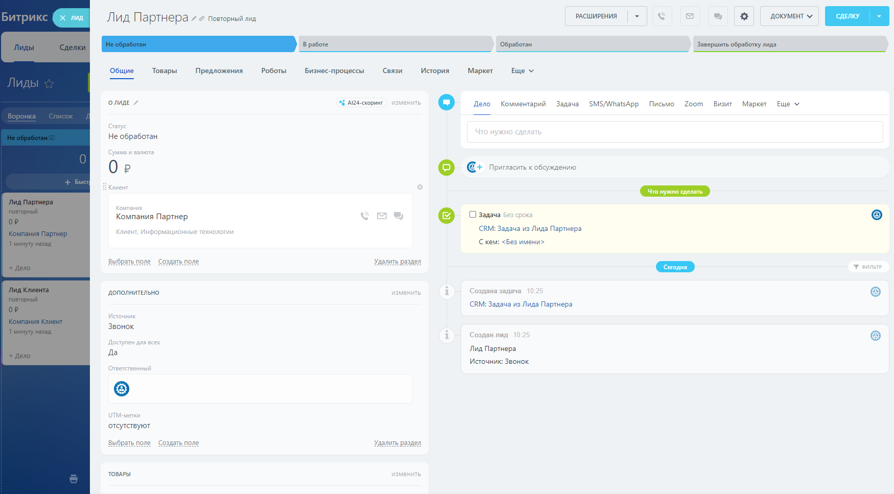 - В задаче создаётся связь со Сделкой/Лидом.
