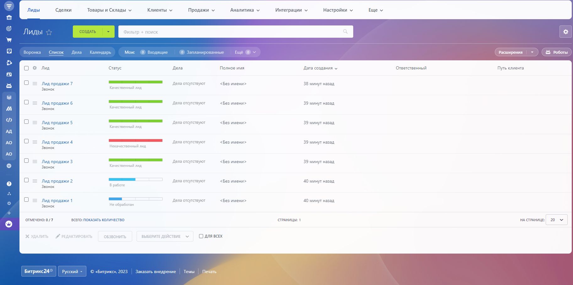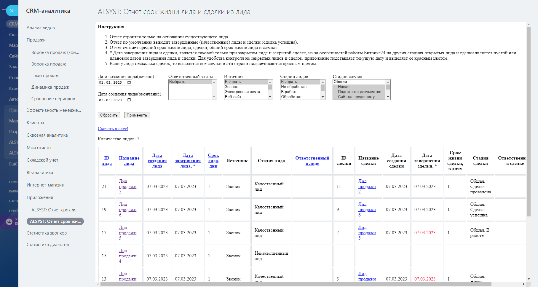 В результате вы получите список Лидов и Сделок по выбранным критериям. В отчёте будет предоставлен срок жизни в днях Лидов и Сделок (с момента создания Лида).