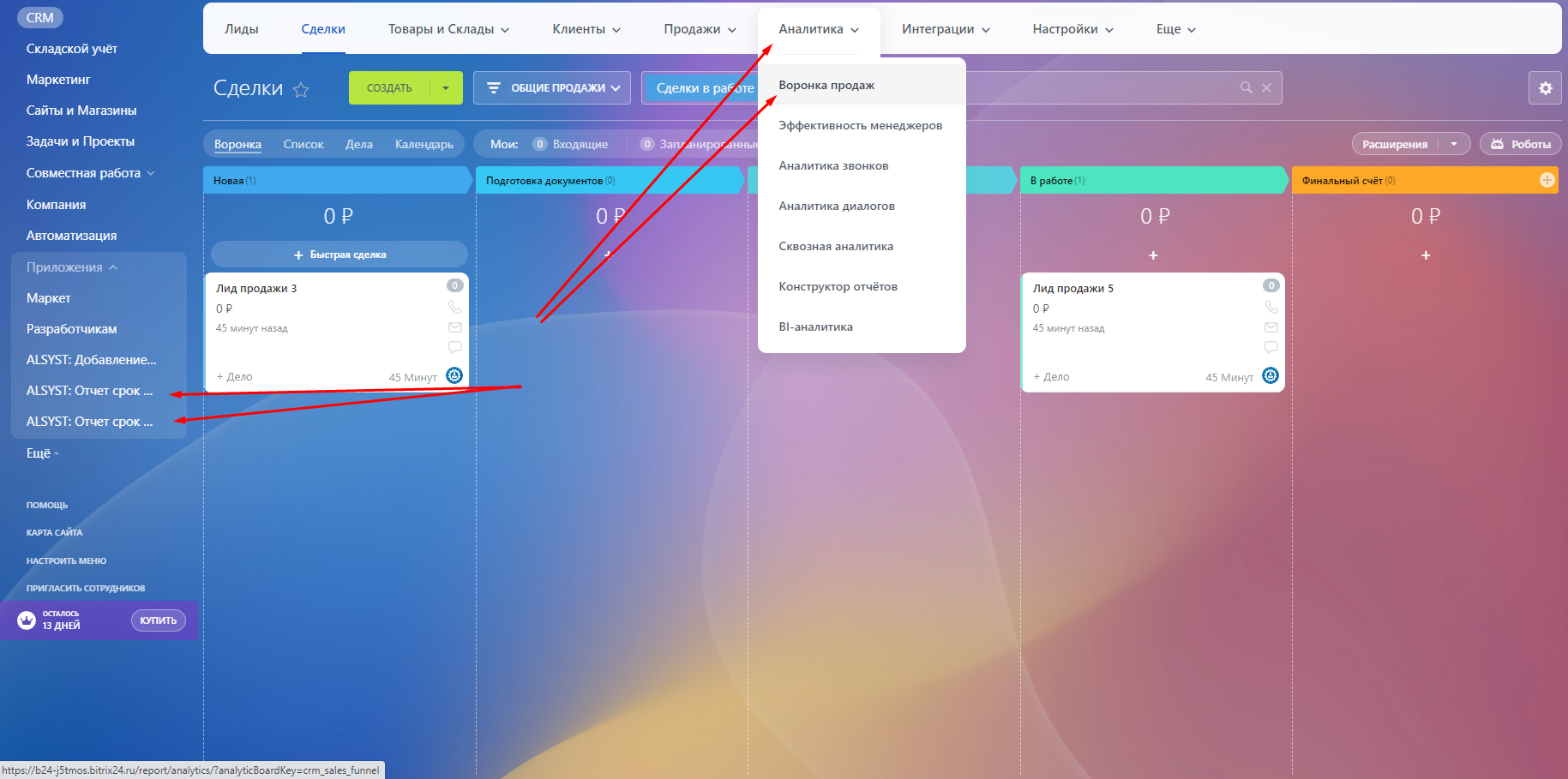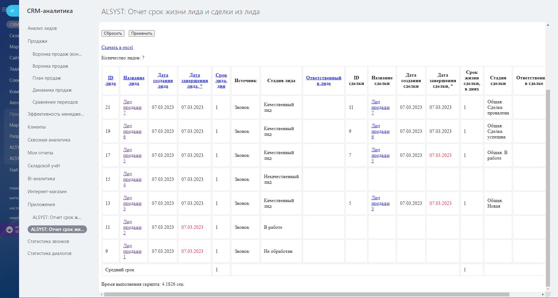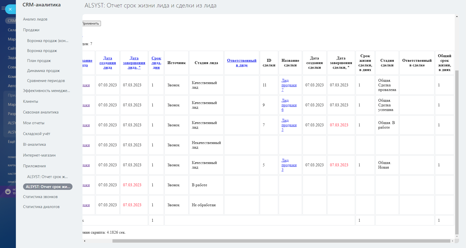 ALSYST: Отчет срок жизни лида и сделки из лида