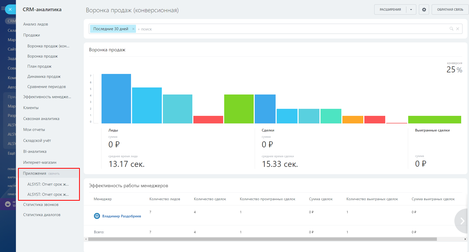Данное приложение подойдёт тем, кто работает с Лидами и Сделками. Для работы только со Сделками рекомендуется приложение «ALSYST: Отчет срок жизни сделки»