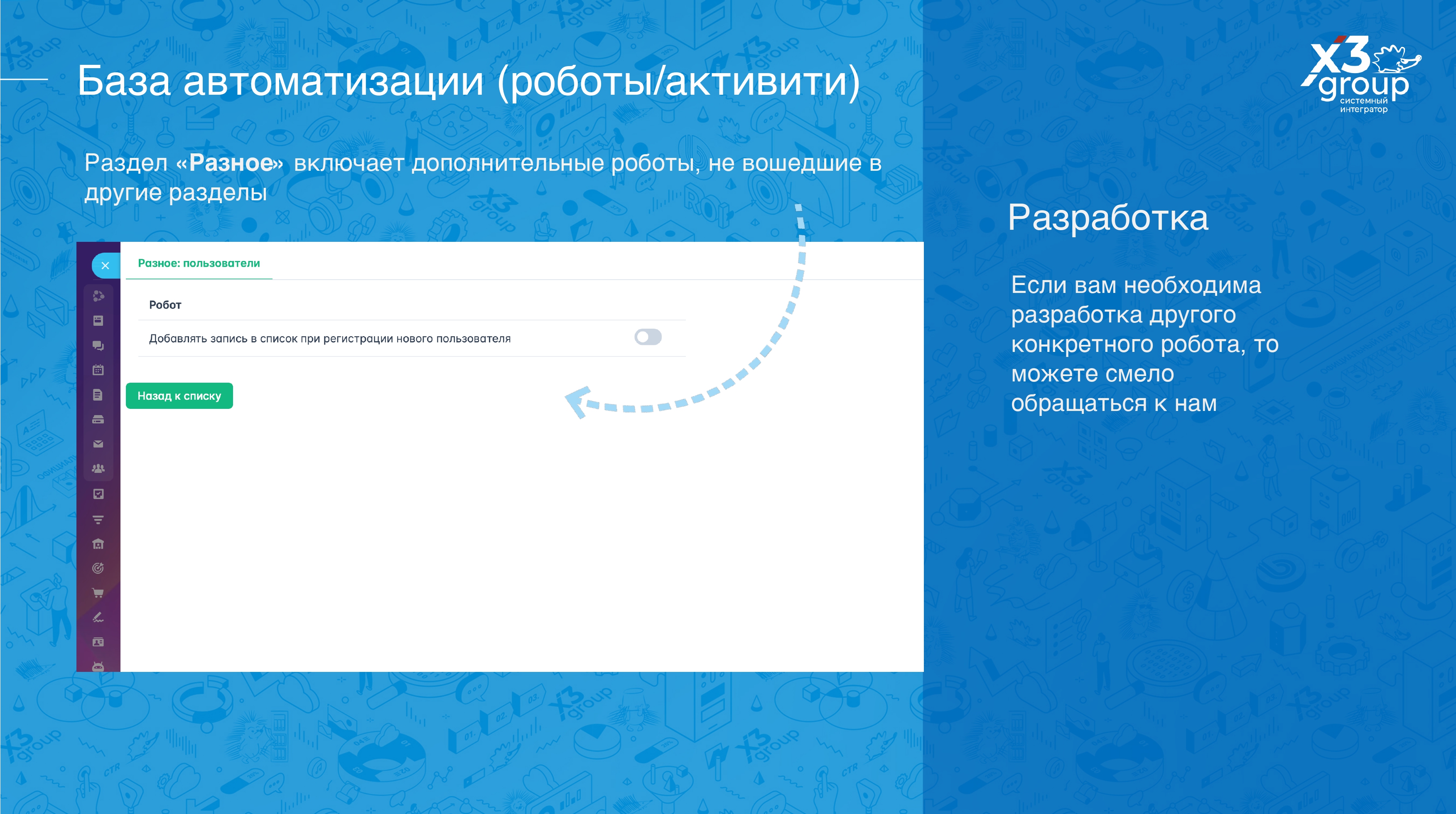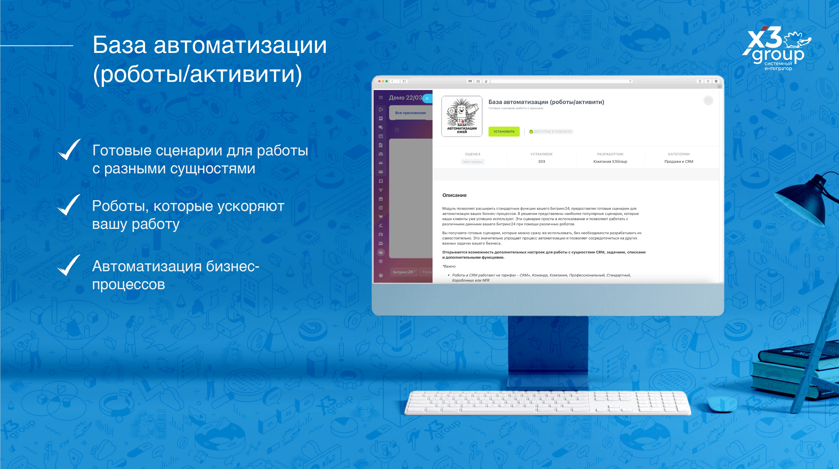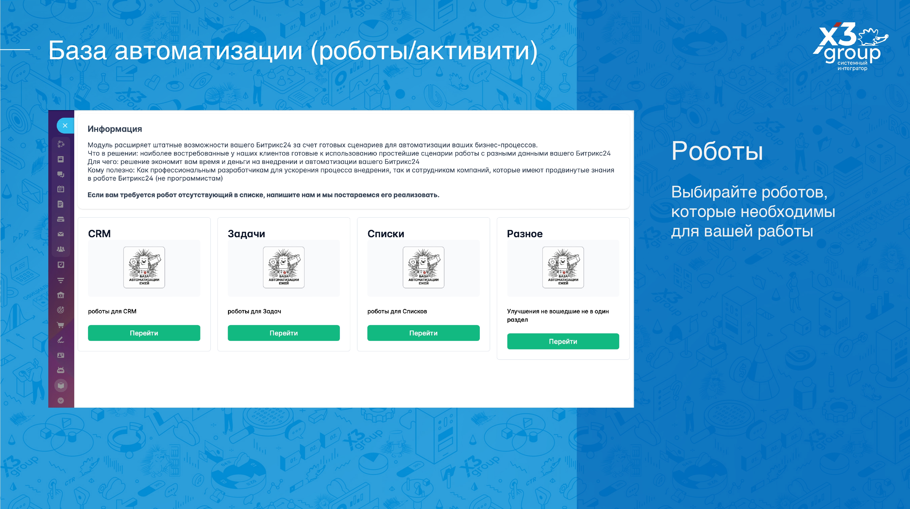 Модуль позволяет расширить стандартные функции вашего Битрикс24, предоставляя готовые сценарии для автоматизации ваших бизнес-процессов. В решении представлены наиболее популярные сценарии, которые наши клиенты уже успешно используют. Эти сценарии просты в использовании и позволяют работать с различными данными вашего Битрикс24 при помощи различных роботов.