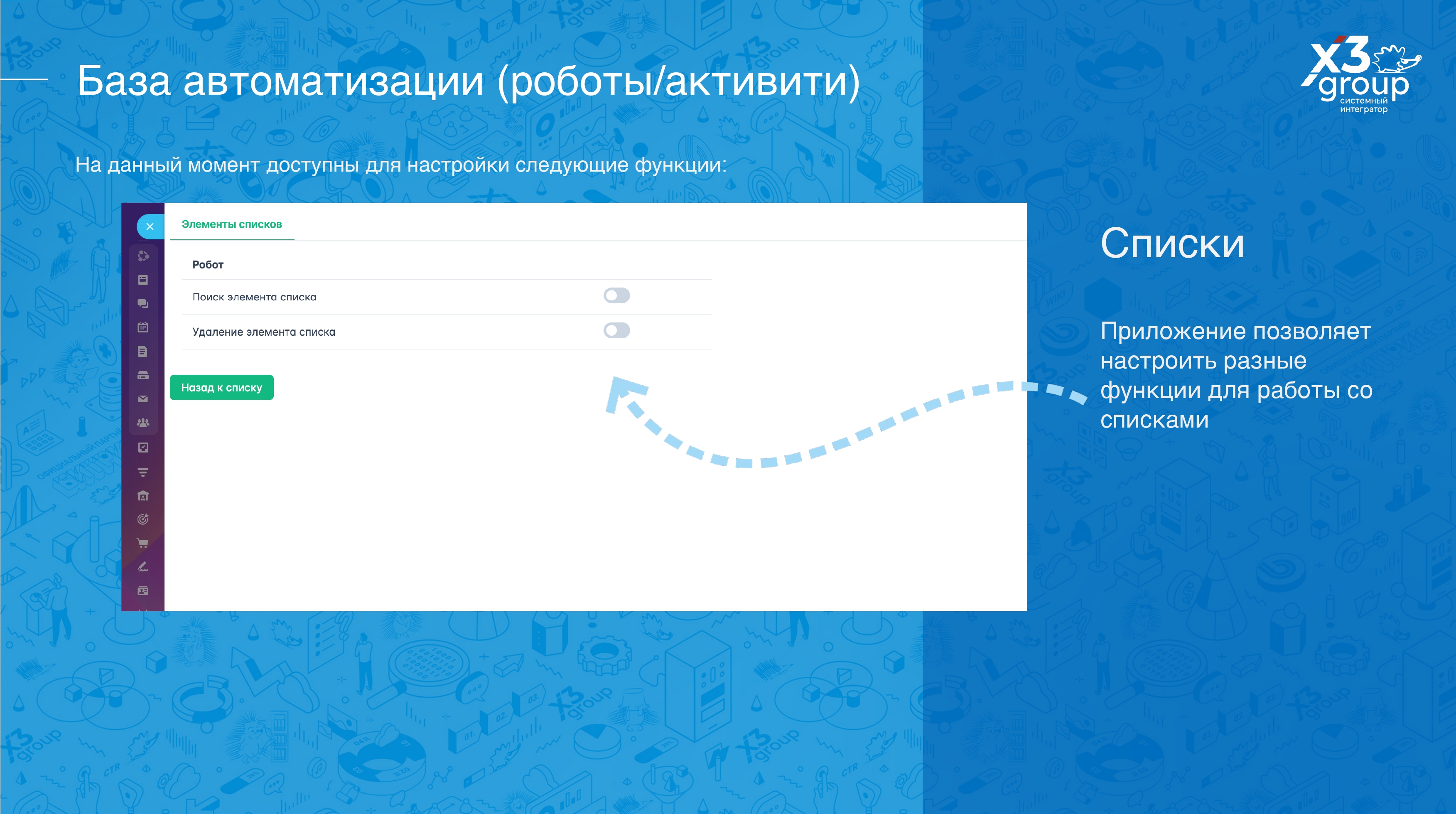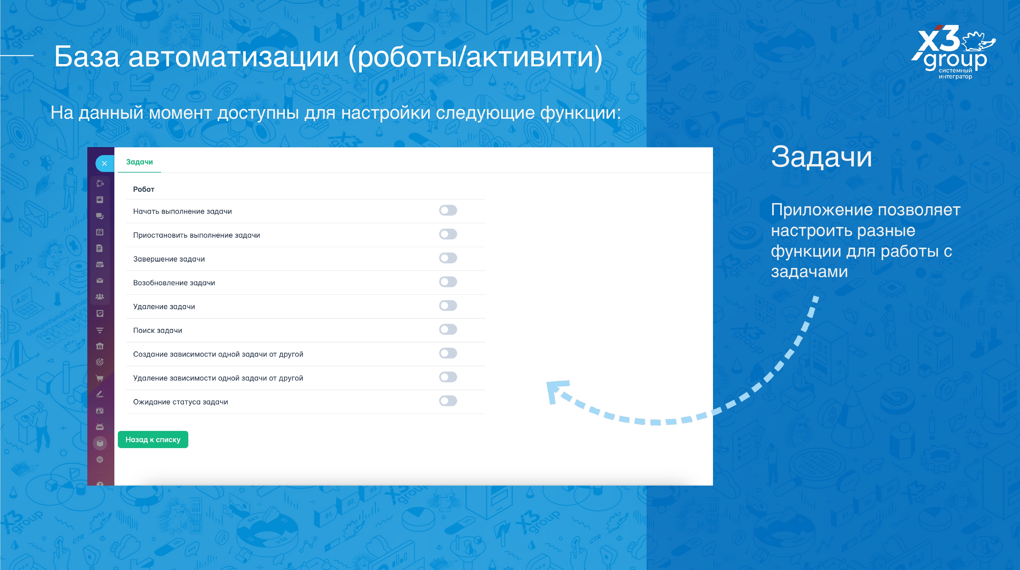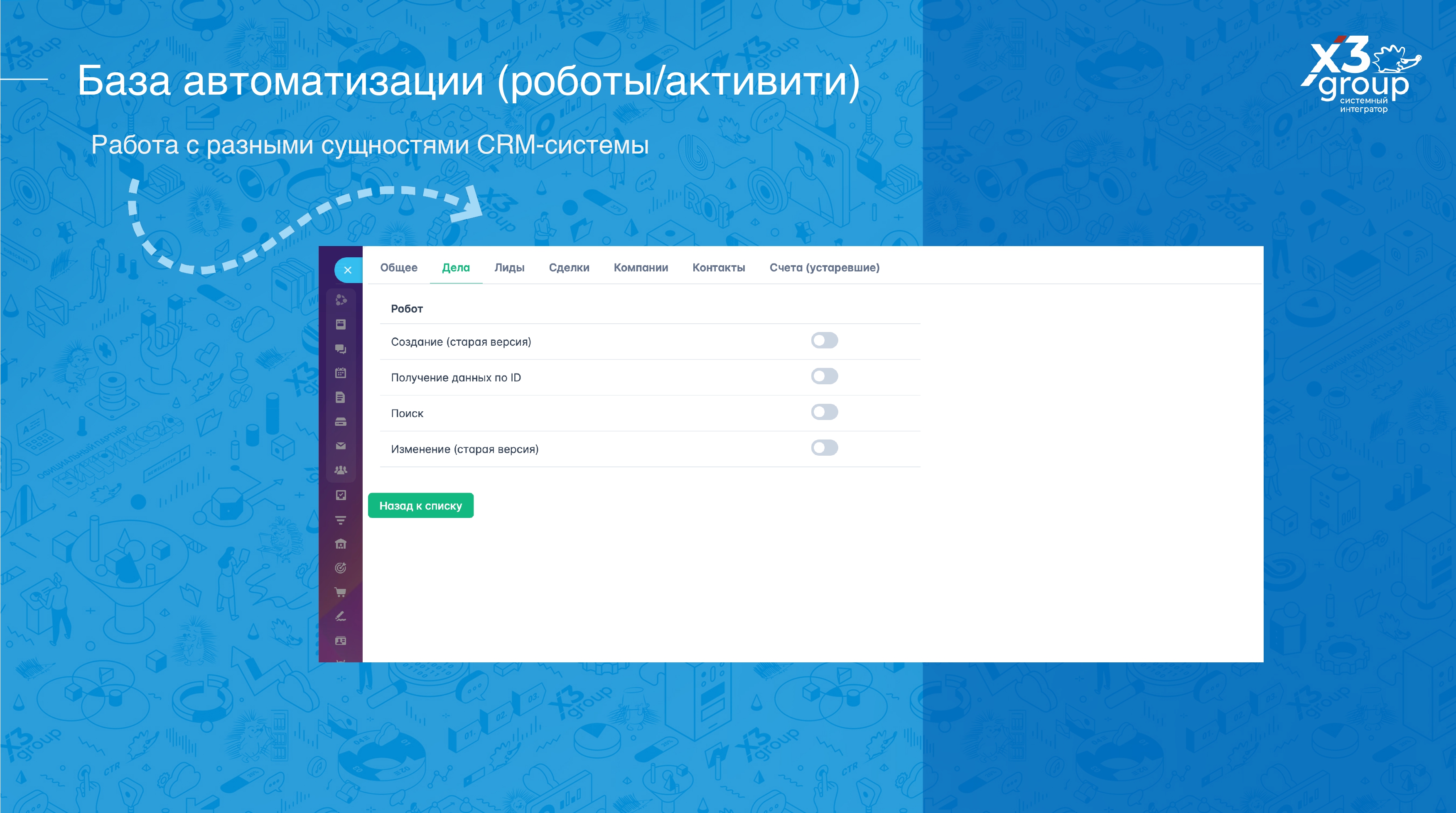Открывается возможность дополнительных настроек для работы с сущностями CRM, задачами, списками и дополнительными функциями.