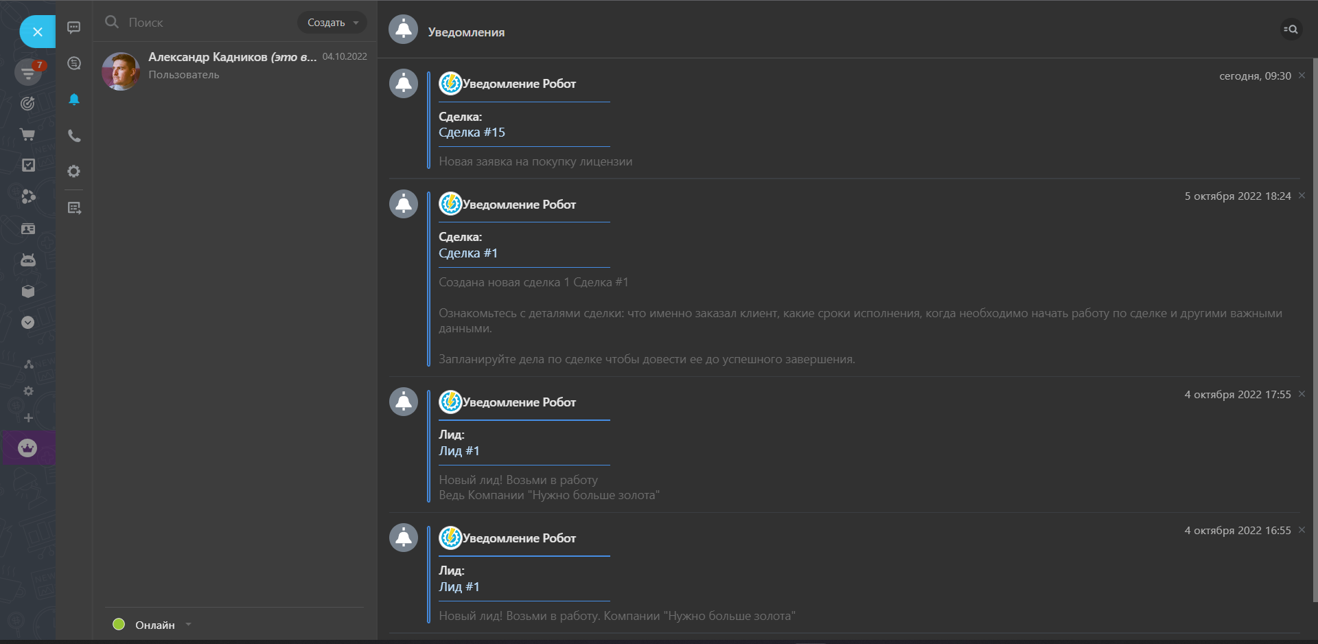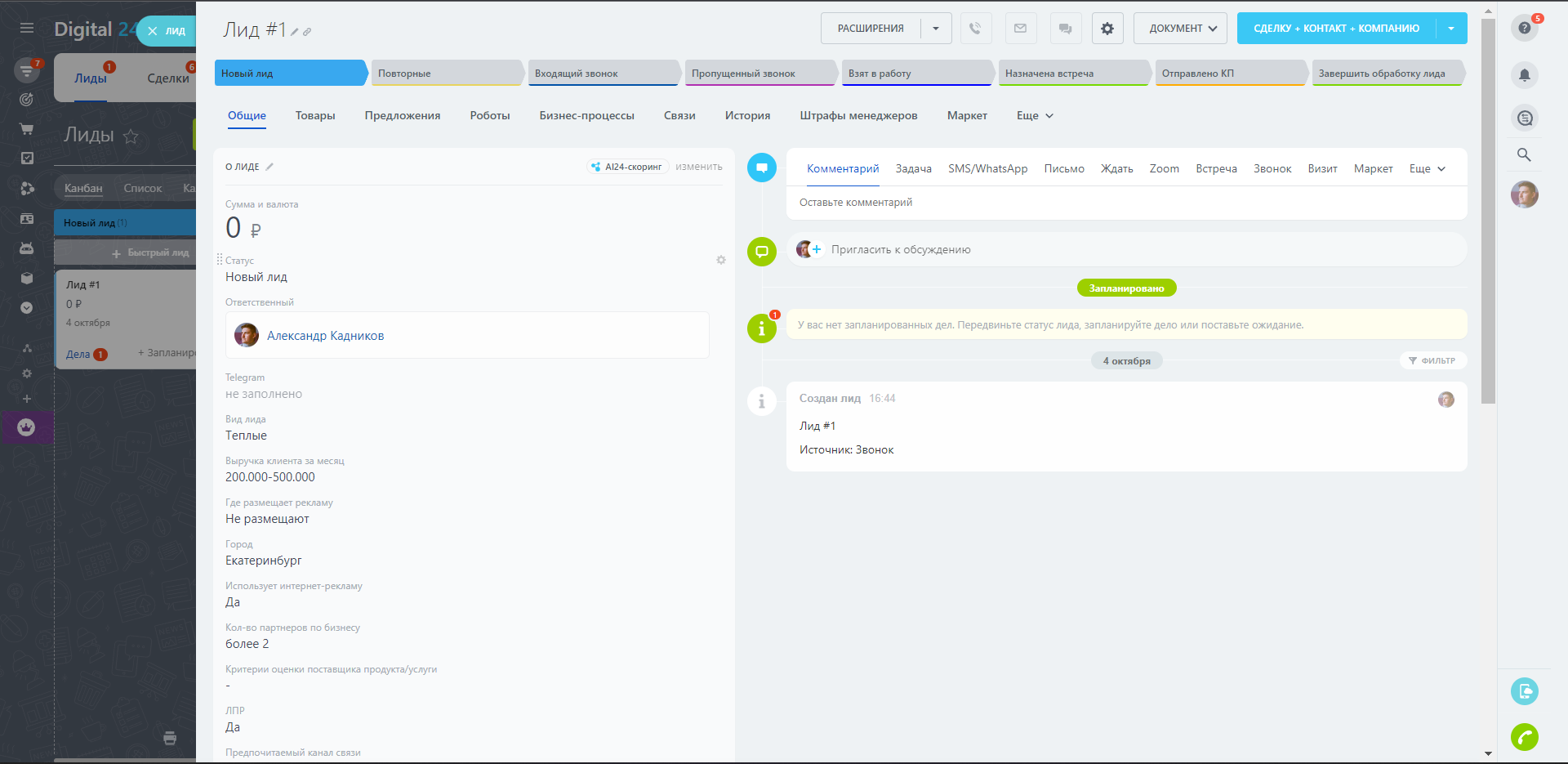Мы настроили воронку лидов, так как многие диджитал агенства работают с лидами. Прописали следующие статусы: «Новый лид», «Повторные», «Входящий звонок», «Пропущенный звонок», «Взят в работу», «Назначена встреча», «Отправлено КП» и закрывающие статусы «Качественный лид», «Некачественный лид». Дополнительно мы написали роботов, которые будут ставить задачи и помогать контролировать статусы руководителю.